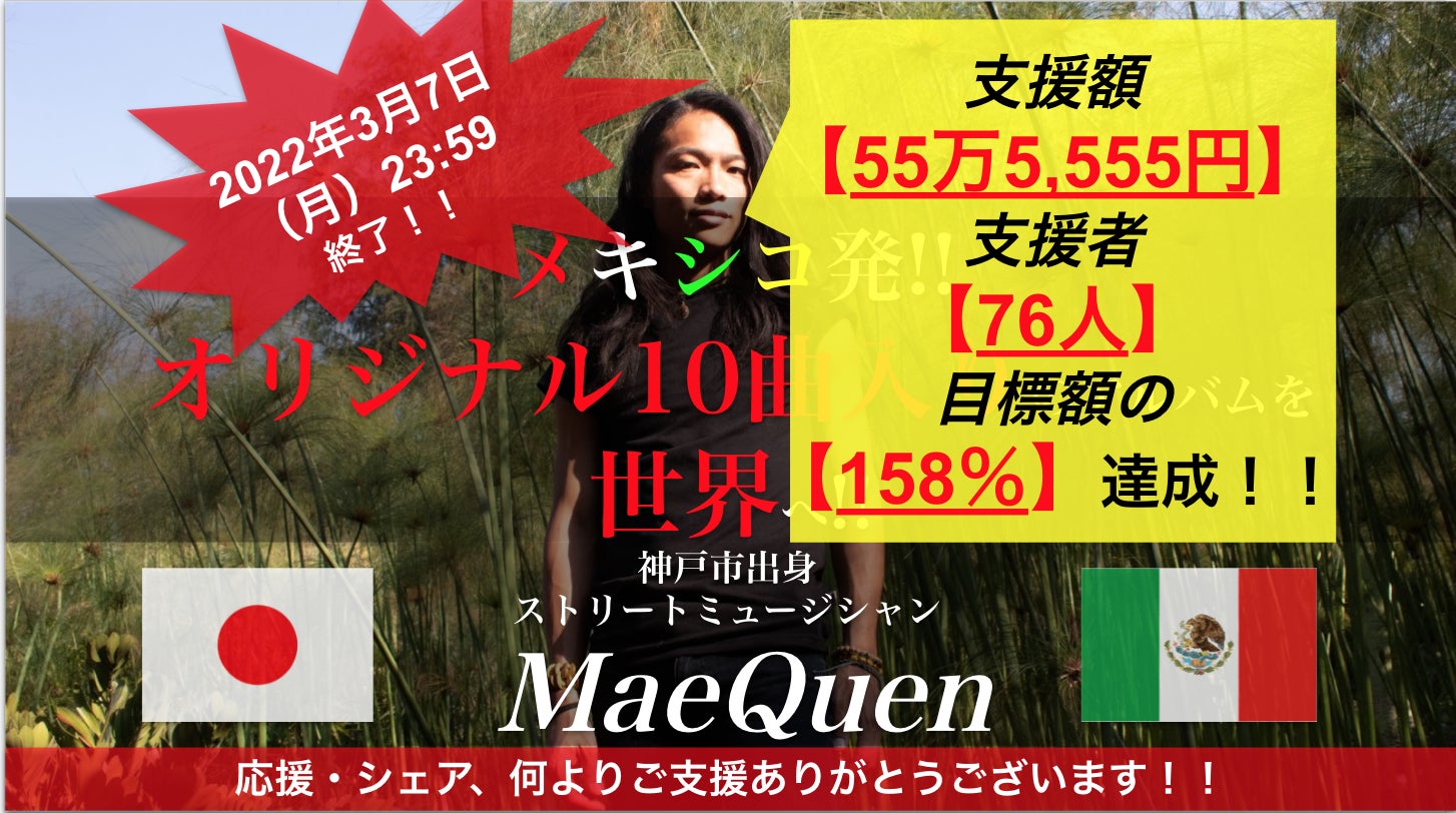 こんにちは。【メキシコでのストリートミュージシャン生活!集大成となるアルバムを創りたい!!】プロジェクトオーナーのMaeQuenこと前田健吾(まえだ・けんご)です。さて、昨晩、日本時間の3月7日(月)23:59に、無事クラウドファンディングが終了致しました。・支援総額:55万5,555円・支援者数:76人・目標金額:158%お陰様でなんと、な、な、なんと、、、目標金額の“158%”を達成することができ、大成功で幕を閉じることができました!!極め付けは、76人もの支援者様から、【55万5,555円】という、美しい”5”という数字の並びのご支援を頂けたこと。余談ですが、自分の名前に”ご”が入っていたり、英語の”GO”のように目標に向かってひたむきに向かっていく響きがあって、それも含めてこのプロジェクトの達成は、忘れられない瞬間になりました。応援してくださっている皆様も楽しめるようにとできる限りのことは尽くしてきましたが、この30日間お楽しみ頂けたでしょうか?SNSや口コミなどなど、沢山のシェア拡散もしてくださり、本当にありがとうございました!!ほぼ毎日ご支援者さまが現れてくださり、コメント欄でも暖かいお言葉や励ましのお言葉を沢山頂戴し、本当に大きな力となっておりました。感謝の気持ちでいっぱいです。皆さんへの感謝の気持ちと今後の流れについて、以下のYouTubeビデオにて伝えさせていただいています。もしよろしければ、こちらもご覧ください↓↓【いただいたご支援について】さてさて、先ほど支援していただいた資金の早期振り込みを申請し、合計46万円ほどが近々振り込まれる予定です。有難いことにストレッチゴールを達成できたお陰で、サポートドラマーをお願いできるなど、より高いクォリティで音源を作れそうです。恐らく音源の製作費全体で、35万円程度になるかと思っています。残りの費用は、リターンや送料などに当てさせていただき、余った場合は機材の費用に充てたいと思います。それも、総勢76名の皆様からの貴重なご支援のお陰です。改めて、本当にありがとうございます。【リターンについて】オンライン系のリターンについて、近いうちに案内のメールを送らせていただきます。ポストカードやアルバムなどの物販系に関しましては、今年6月頃の発送を予定しています。少し間が空いてしまいますが、気長にお待ちいただけると有難いです。【今後の流れについて】順調にいけば、3月下旬からレコーディングを開始して、4月末には音源が完成、5月末にCDが手元に届くという流れになっております。ちなみに、僕自身は6月頃に帰国する予定です。お時間ある方、一緒に飲みに行きましょう!但し、世界情勢が不透明な昨今は航空運賃も値上がり、通貨の動きも不安定ですので、リターンの発送や帰国時期など、ズレることもあるかもしれません。また、慣れないメキシコでの仕事という面も、そこに関わってくるかと思います。予め、ご了承いただけると幸いです。【アーティスト・MaeQuenについて】6月に帰国して以降は、しばらくの間日本に滞在する予定です。が、僕は世界各国でインスピレーションを受けながら、自分オリジナルの音楽を創っていきたい。他にも、TinyDeskConcert出演や国歌斉唱など、色んな夢がまだまだあります!その道すがらを、僕と一緒に楽しんで頂けたら、嬉しいことこの上ありません。このクラファンを経て、僕の本当の挑戦は始まると思っています。SNSなどを通じて音源や活動の様子を発信していきますので、これからもぜひ、一緒に楽しんでいきましょう!!ではでは!!【Twitter】@maeekenn-maekenhttps://bit.ly/39n833e 【Facebook】@MaeeeeeeeeKeeeenhttps://www.facebook.com/MaeeeeeeeeKeeeen-104894821209809?locale=ja_JP【Instagram】@maequen_uuwwaarhttps://instagram.com/maequen_uuwwaarr【SoundCloud】@Mae-Quenhttps://soundcloud.com/mae_quen_mexico【You Tube】@MaeQuen-Channelhttps://www.youtube.com/channel/UCRjBLI0BxhdSEjp0IQS9kOQ【note】https://note.com/maeekennクラファンページはコチラ↓↓【メキシコでのストリートミュージシャン生活!集大成となるアルバムを創りたい!!】https://camp-fire.jp/projects/view/550255オリジナル曲↓↓