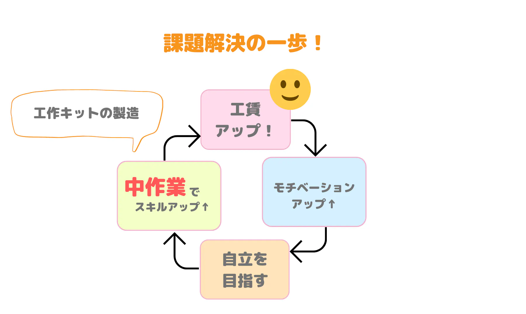 就労支援施設の課題解決と私たちの目指す姿を実現するために、負のスパイラルの中の「軽作業」の部分に着目、工作KITを作成する事で軽作業を中作業にすることで課題を解決していきたいと考えます。