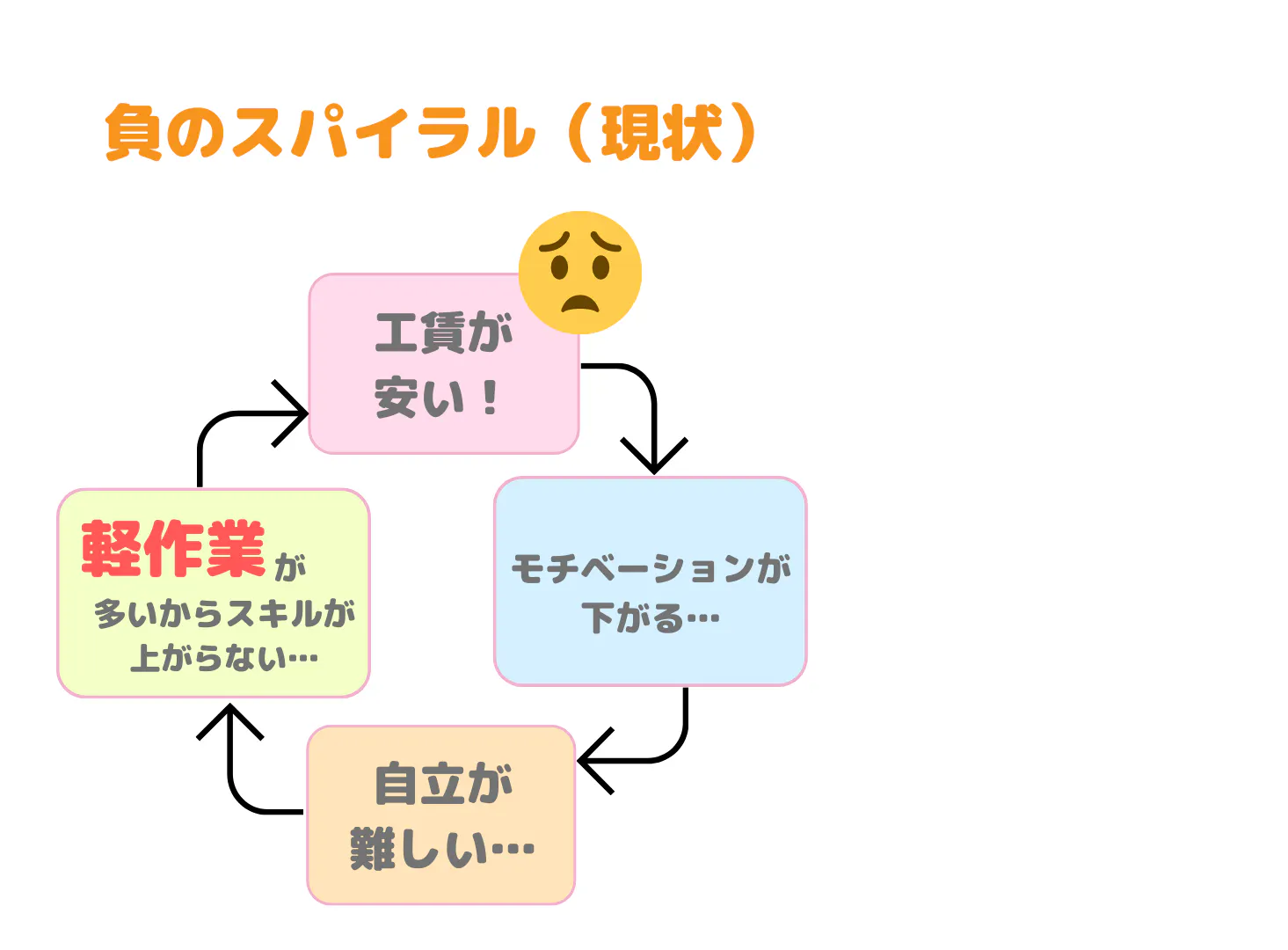 軽作業→工賃が安い→モチベーションが下がる→自立が難しい→低作業
