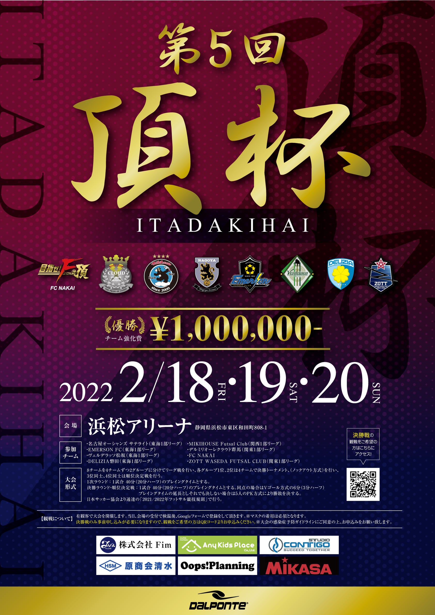 2022/02/17 23:06クラウドファンディングの募集期間が終了致しました。何と目標の201%となる604,000円ものご支援をいただきました。ご支援いただいた皆様、本当にありがとうございました。今回のクラウドファンディングで、自分たちがどれだけ多くの方に支えていただいているかを改めて感じることができました。これからも皆様にご支援していただくに相応しい熱量で活動していきたいと思いますので、今後ともヴェルデラッソ松阪へのご支援、ご声援、宜しくお願い致します。さて、当プロジェクトの本来の目的であった「第22回 F地域チャンピオンズリーグ」は残念ながら中止となってしまいましたが、急遽開催される「第5回 頂杯」への出場が決定しました。地域CLにも出場予定だったチームを中心に全国の強豪が集まる大会です。是非ご注目下さい。また、今大会は有観客開催となりますので、会場での応援も宜しくお願い致します。第5回 頂杯日程:2022年2月18日(金)~2月20日(日)会場:浜松アリーナ(静岡県浜松市)<出場クラブ 及び 予選リーグ組み合わせ>AブロックBブロックFC NAKAIZOTT WASEDA FUTSAL CLUBデルミリオーレクラウド群馬DELIZIA磐田EMERSON FCMIKIHOUSE Futsal Clubヴェルデラッソ松阪名古屋オーシャンズサテライト<試合スケジュール>2/18(金)17:30- vs.EMERSON FC2/19(土)10:00- vs.デルミリオーレクラウド群馬2/19(土)16:00- vs.FC NAKAI2/20(日)10:00- 準決勝・7位決定戦12:00- 5位決定戦14:00- 決勝戦<観戦について>今大会は有観客開催となります。当日、会場での検温後、Googleフォームで登録をしていただきます。決勝戦のみ事前登録が必要となります。https://docs.google.com/forms/d/e/1FAIpQLSeztKdfd1OHgcOVnFsninEyIMCROrWF-XibyEnWVXNvsqV72Q/closedform もっと見る