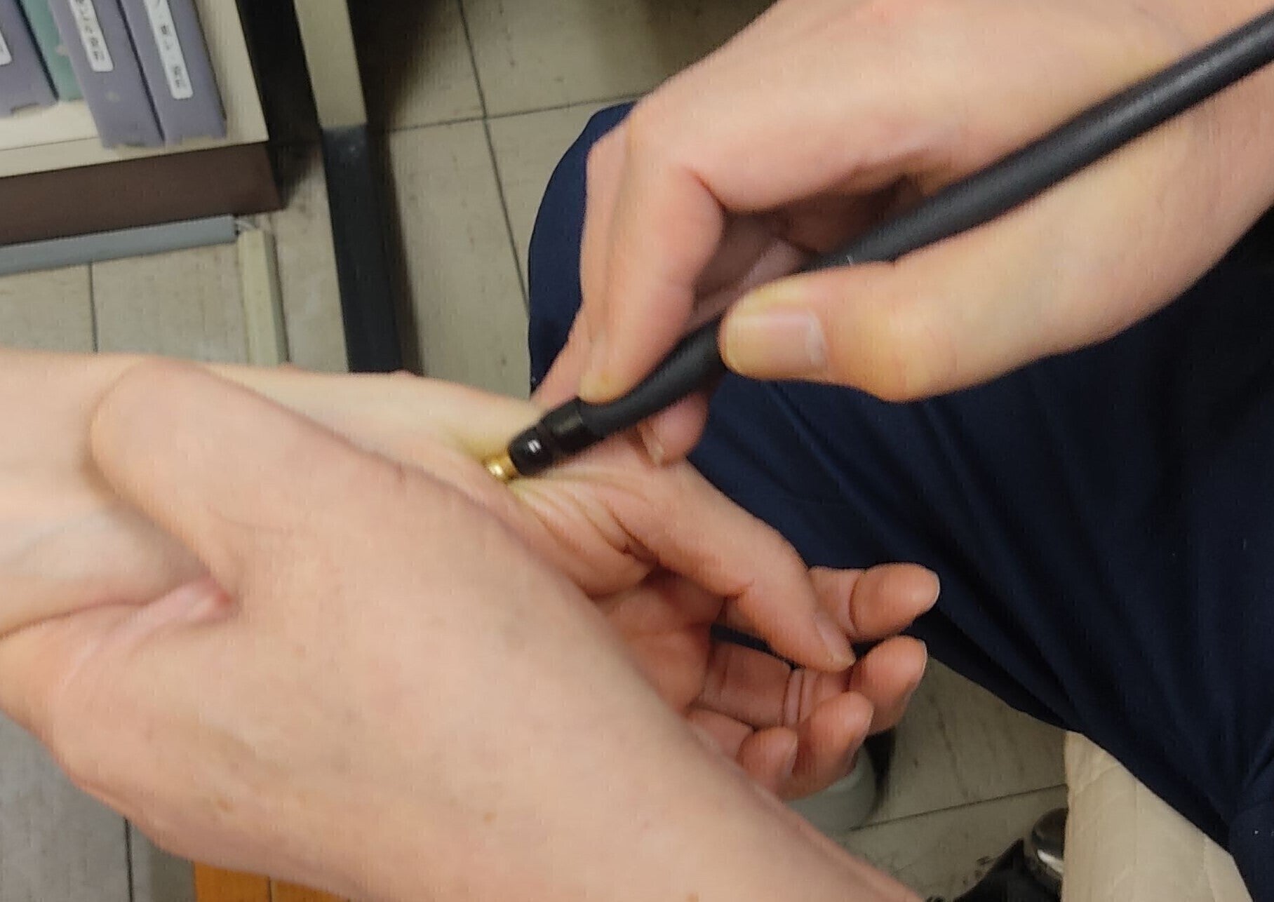 新経絡治療には、鍼ではなくこの押し棒を使います。脳神経に働そのため子供たちも怖がらず、治療を受けられます。帯状疱疹後神経痛 の治療にもこの押しきかける手のツボを押し棒で押して血流を回復させて患部の組織の修復を促す治療法です。棒を使います。