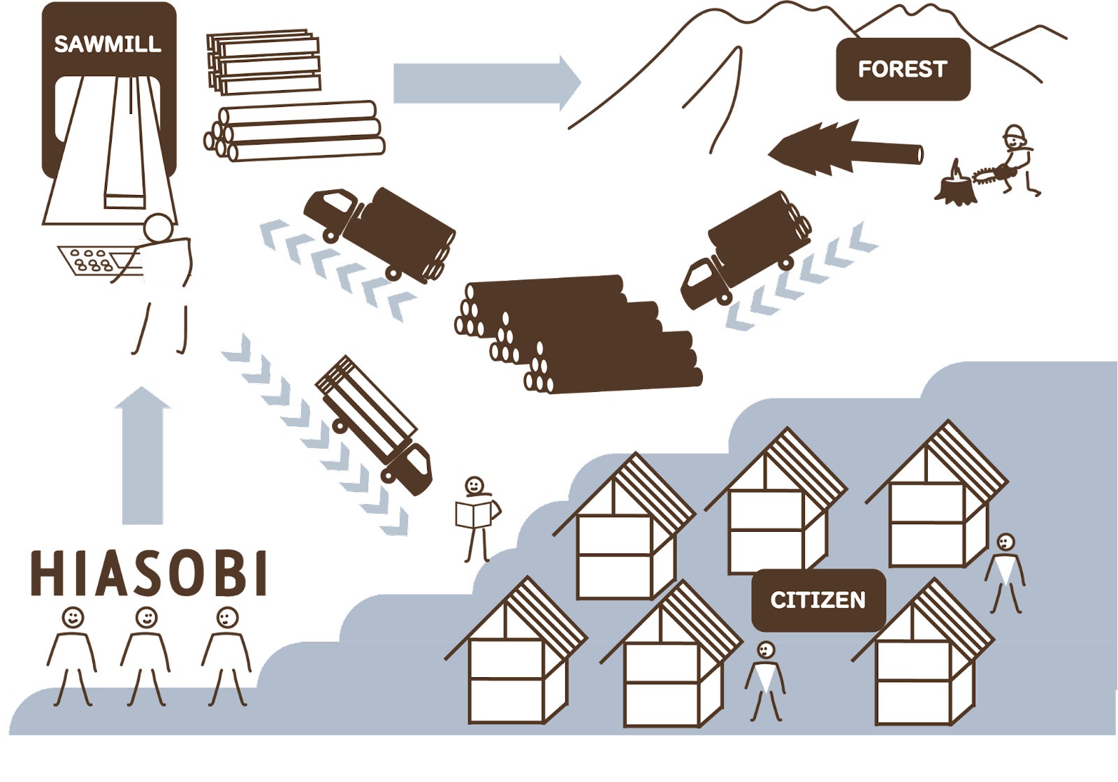 HIASOBIは製材所の端材から生まれました。1本の木を無駄なく使い切ることは、衰退した日本の林業に収益を生み出し、森林資源の循環に繋がります。