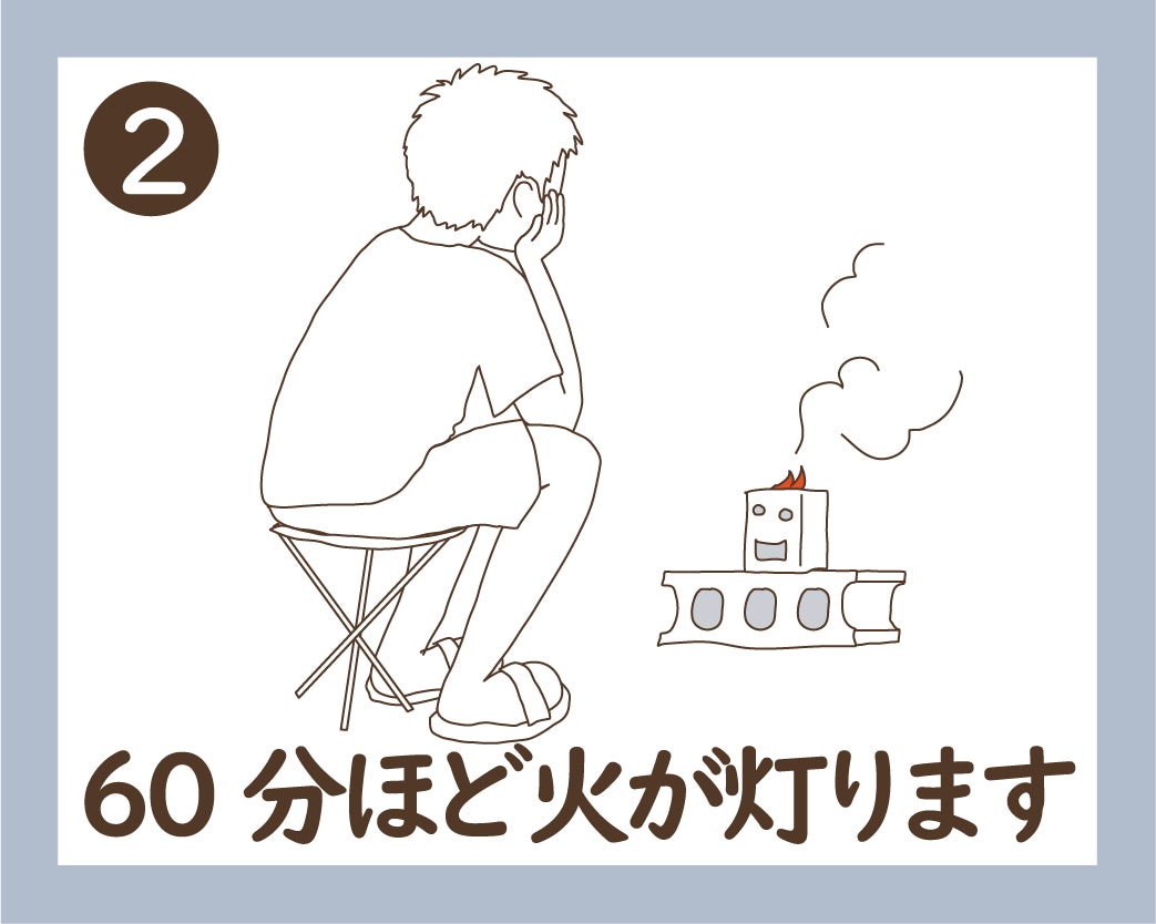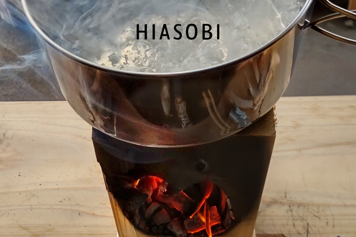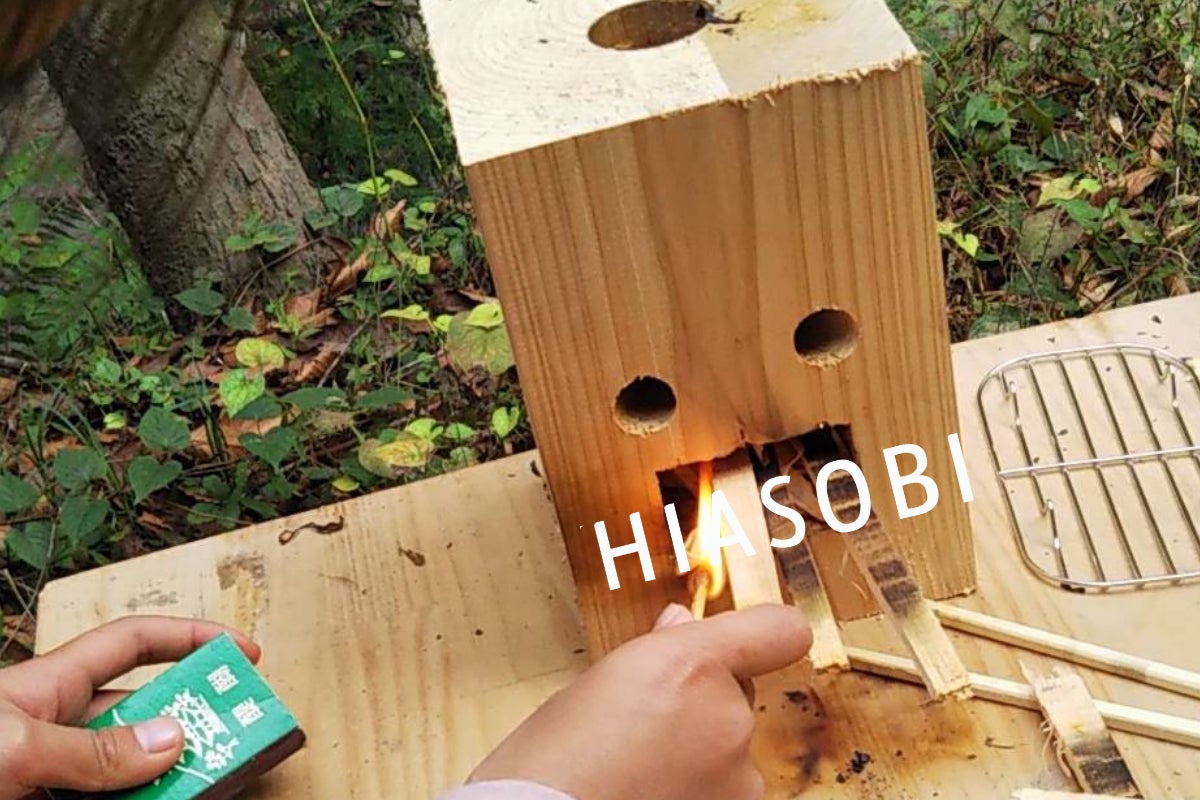 簡単には火が付かないHIASOI。フーっと息を吹きかけたり、端材のくべ方を工夫して火を育むことに時間を忘れて没頭します。空気の通り道が付いているので、HIASOBIの上でコンロとして食事を調理したり、火を囲んで談笑したりと特別な時間を過ごすことができます。