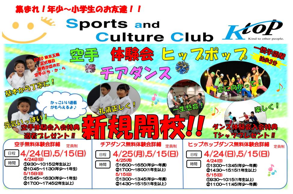 2022/04/28 18:124/25,26に空手、ダンスの体験会を行いました。いよいよ5月からスクール開講となります!5/15(日)にも体験会を行いますので、興味のある方はお申し込みください(^^)/そして、ご支援いただいた皆様①バッジが5月中旬くらいからお渡しできます。予定より遅れており申し訳ございません。とてもかわいいデザインなので楽しみにしていてください(^^)②個別指導その他個別調整が必要なものは長期休みに向けて準備していきます。お名前等ご連絡いただいた皆様ありがとうございます。バッジも含めてまだご連絡いただけていない方は、メッセージにてお知らせください!※GW休業期間:4/29(金)~5/10(火) もっと見るやっと・・・