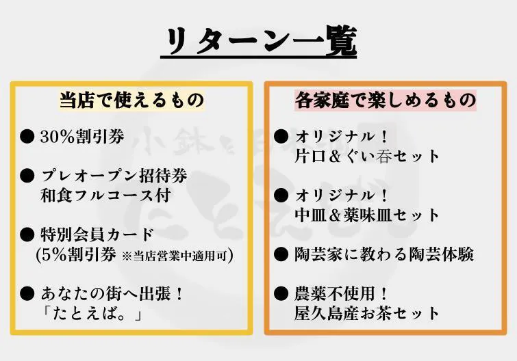 当店を最大限楽しんでいただくためのリターンをご用意いたしました。こだわりをふんだんに詰め込んだので、様々なジャンルのリターンをお楽しみください。クラウドファンディング限定のものもご用意させて頂きました。この機会だけの特別品となりますので、楽しんで見て頂けると幸いです。