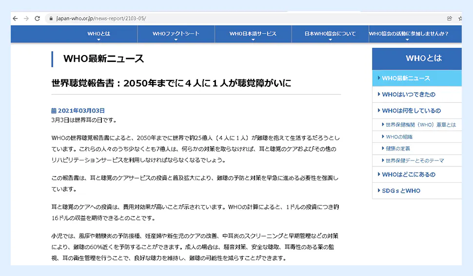 2021年にWHOが発表した「世界聴覚報告書」によると、2050年までに世界で約25億人(4人に1人)が難聴を抱えて生活することになるだろうと言われています。(注:https://japan-who.or.jp/news-report/2103-05/) 実際、近年では、密閉度の高いヘッドホンで大音量での視聴により音エネルギーが鼓膜経由で聴覚神経に伝わる、「子供難聴」という健康問題が頻繁に発生しています。