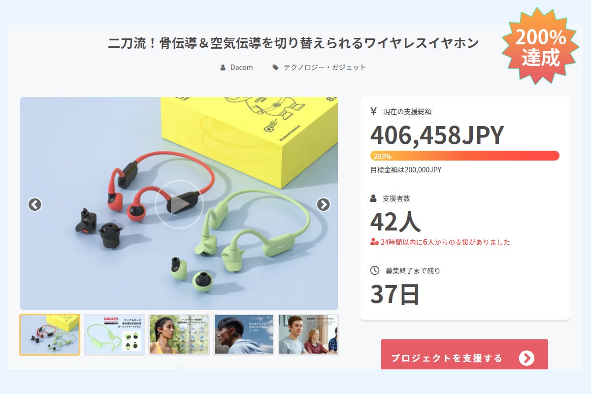 おかげさまで、今回骨伝導&空気伝導のデュアルモードオープンイヤーイヤホン「Dacom Gemini G150」のプロジェクトが200%目標に達成したました。