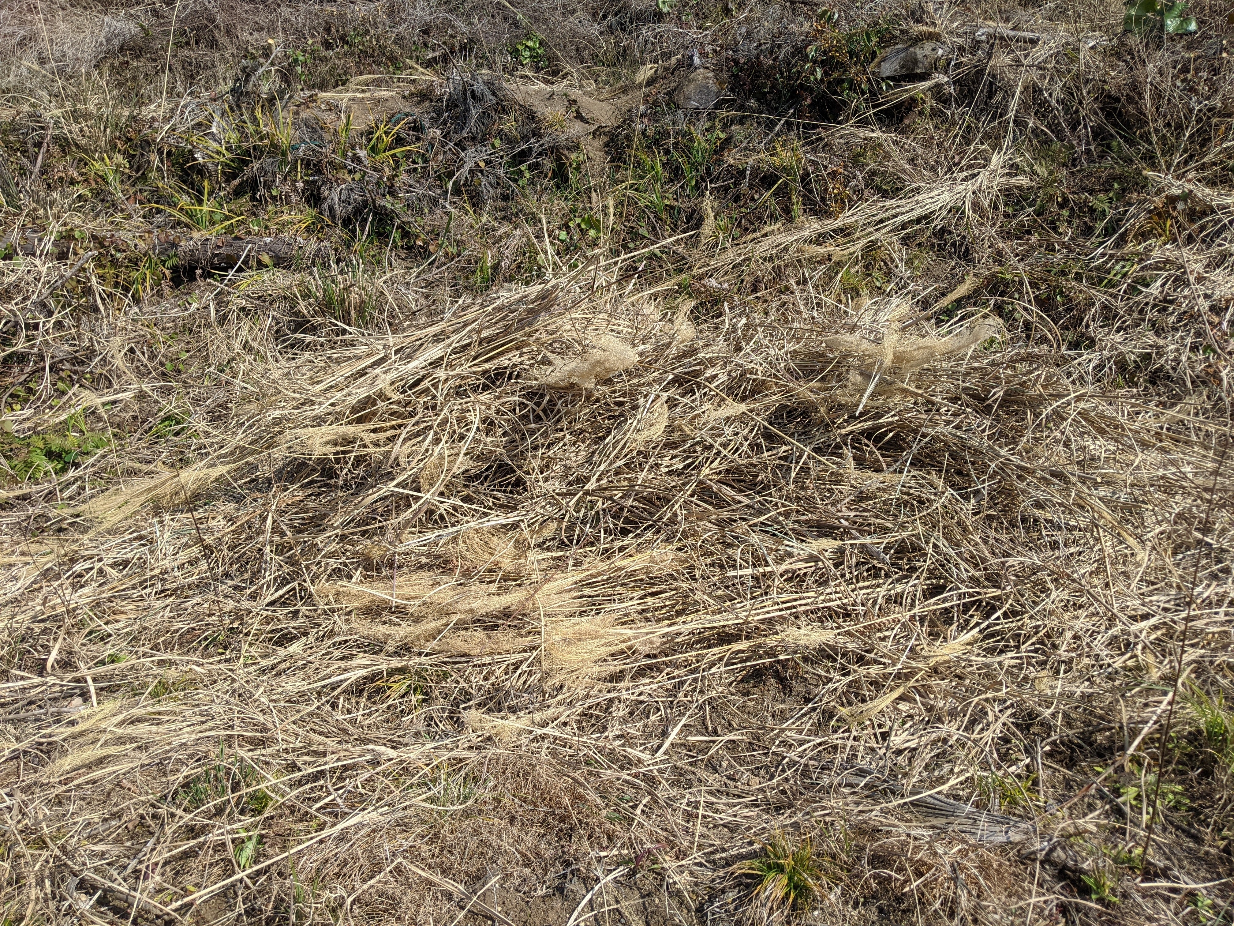 里山の整備をしている上で大量のカヤが残るのですが、実はこのカヤには結構大事な役割があります!植林をする際周りの草木をどけて植える関係で土が露出してしまいます。そこで今回刈ったカヤを被せて地面が乾きすぎないように守ります。今回は特に日当たりが非常に良いのでカヤの役割も一段と大きそうです!