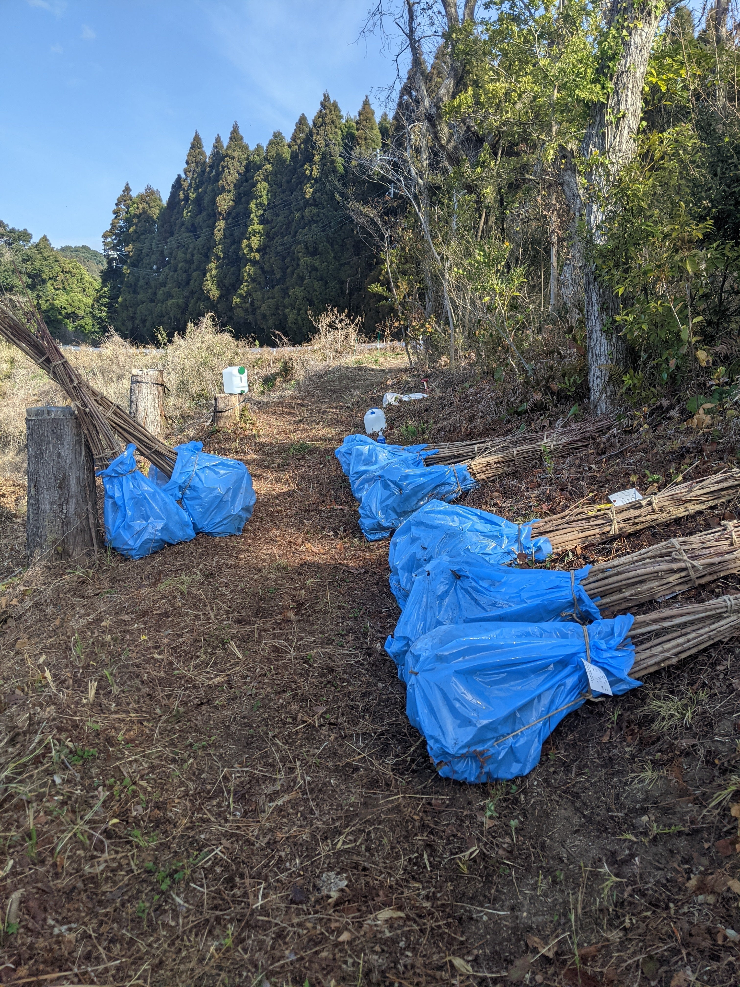 植林2日目は、苗の仮植えをしていきます。昨日実際に植林をして自分の思っていたよりもだいぶ時間がかかることがわかりました。ですので今週一杯かけてすべて植える計画に変更!その間苗が枯れてしまわないように地面に仮植えをしていきます。写真のように根っこに袋が被っていますが長期保存には向かないため仮植えをし、そこから植林をしていきます!