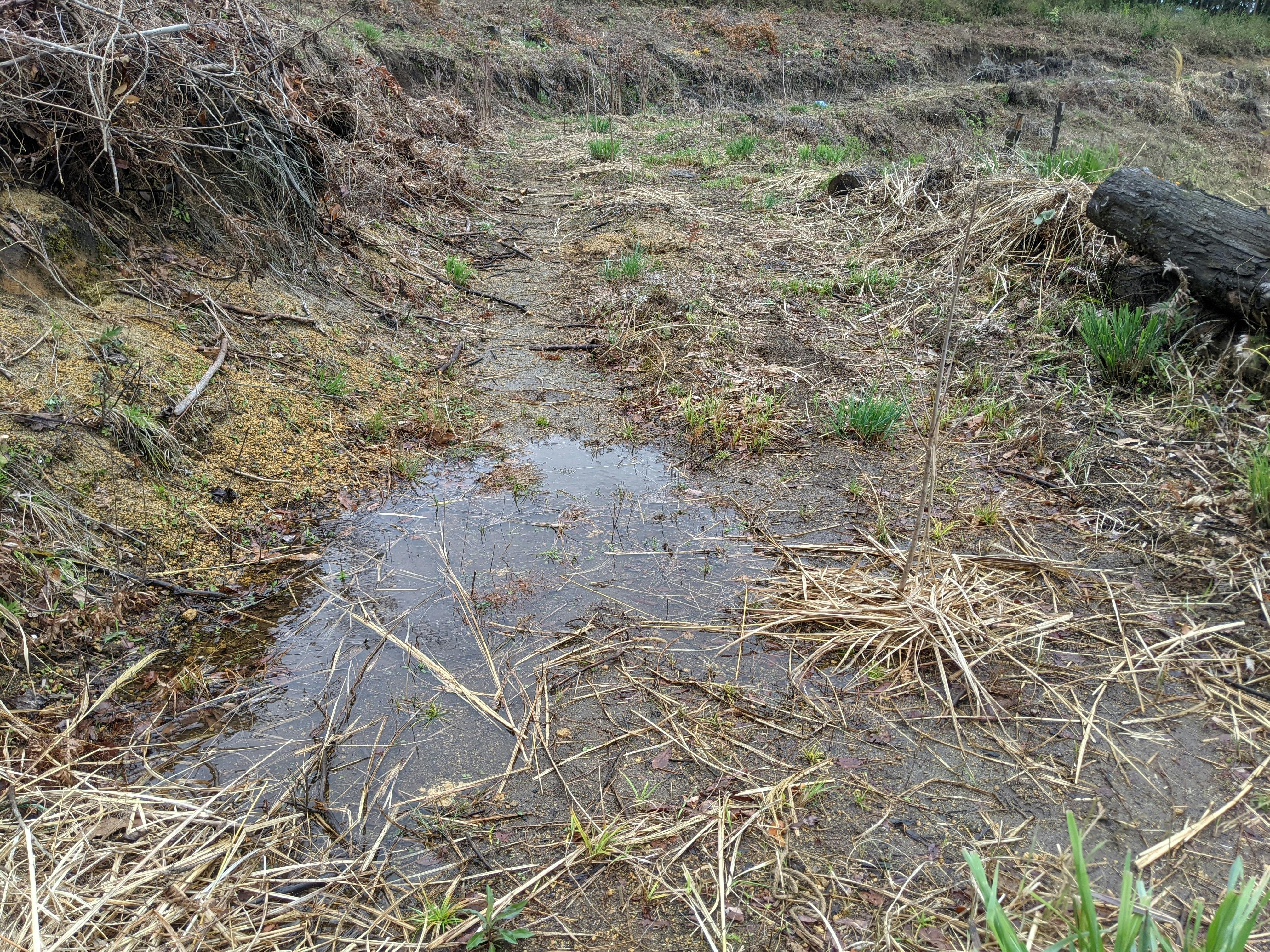 さて、雨のあとの様子が気になったので既に植えた子たちの確認に行ってきました。幸い風で倒れている。と言うようなことはなかったのですが、写真のように大きな水溜りができている場所が!ハゼノキに大切なの「日当たりの良さ、水はけの良さ」です。このような雨が降ると大きな水溜りになる場所は植樹場所には適さないため、一時避難させることになりました。