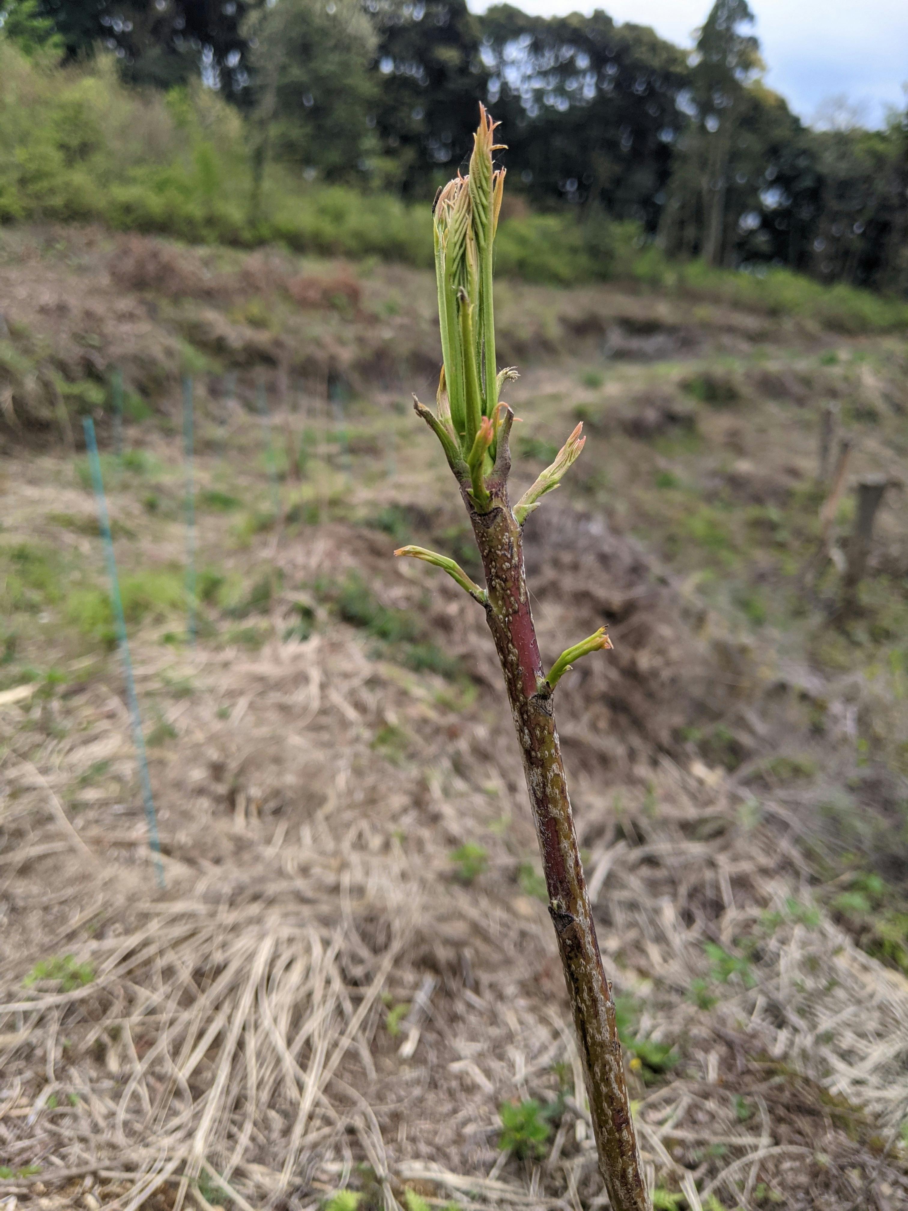 さて、植林が完了して10日ほど経過しましたが、発芽は50本ほどになりました。現在は幹や枝の剪定を行っており、1番高い苗は既に2mを超えていますがすべて1mほどに切りそろえていっています。海沿いでは自然木のハゼノキが新芽を広げていっているので、もうすぐこちらの芽も開いて新しい若葉が見れると思っています!
