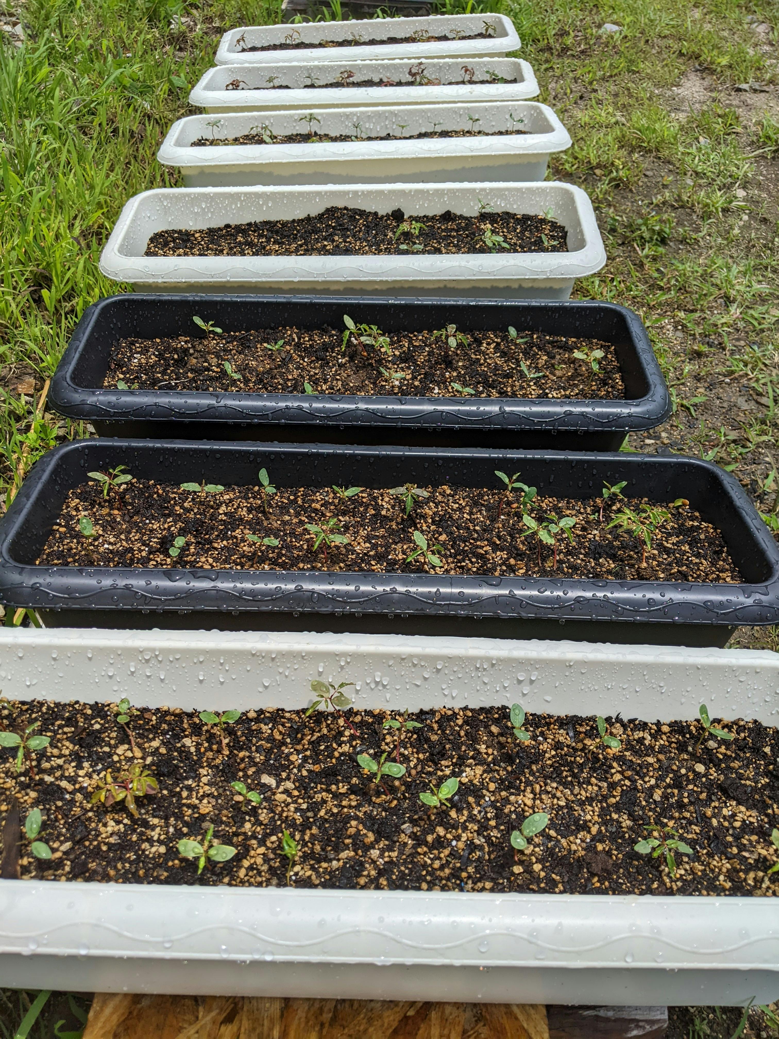 さて、そんなに雨を前に畑で育てていた台木用の苗を移設することになりました。播種するタイミングを合わせて里山近くの畑と海側を比較していたのですが、畑の成長が非常に遅く小さくしか育たないためポッドに移し替えて培養土でしばらく様子を見ることにしました。