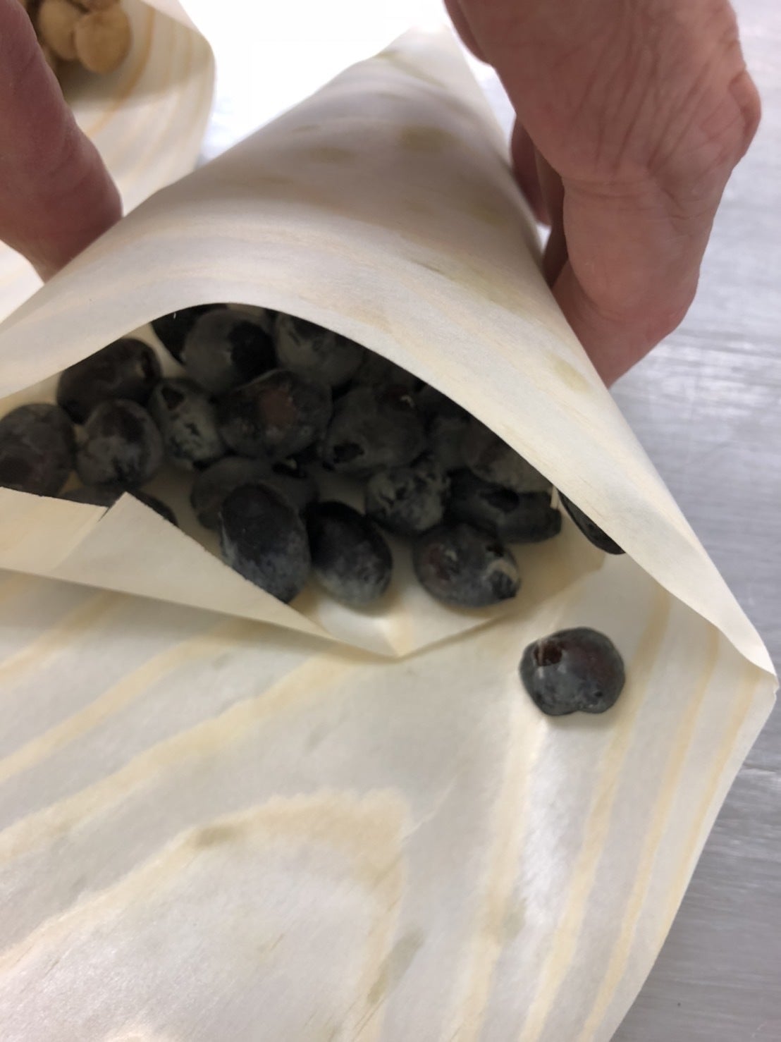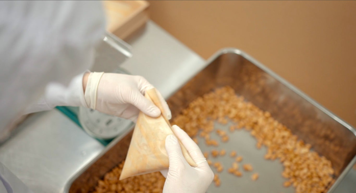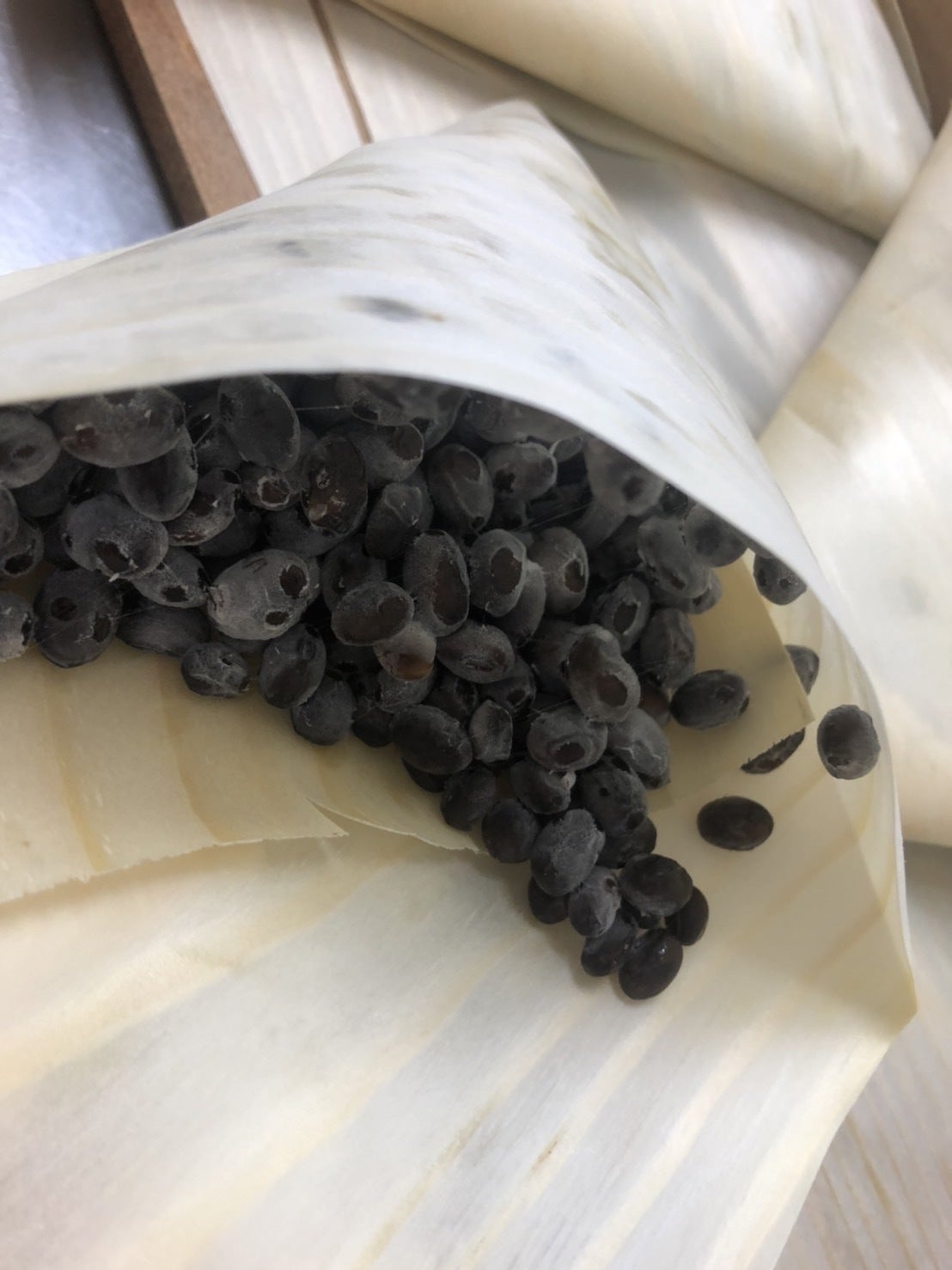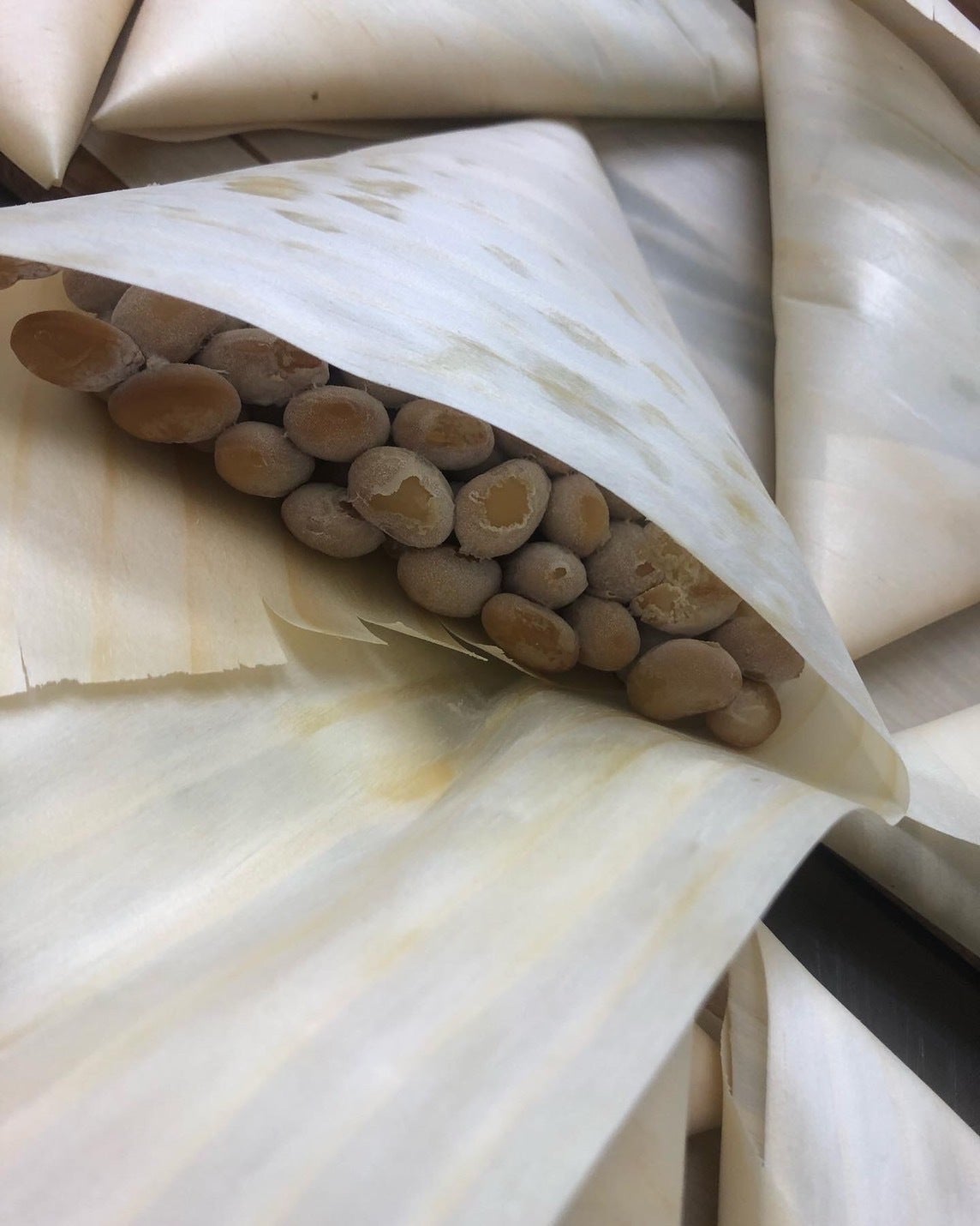 それぞれの豆に合わせ蒸す時間を調整し、納豆菌を二段階に分けしっかり行き届かせ、手で折った経木に包み約17時間(豆の年度、粒径、季節により調整します)備長炭を使い発酵させます。