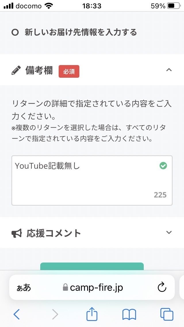 けんタクさんのリターン全2種について、『けんタクYouTubeチャンネル』(3月中開設予定)のクレジットにお名前を記載する権利が含まれている関係で、備考欄にクレジット記載を「希望する」か「希望しない」のどちらかをご入力いただく必要がございます。(画像参照)また、「希望する」を選ばれた場合、記載して欲しい「お名前(ニックネーム可)」、「都道府県」、「市区町村」も合わせてご記入をお願いいたします。例)東京都 世田谷区 天草太郎様お手数をお掛けして申し訳ありませんが、何卒よろしくお願いいたします。