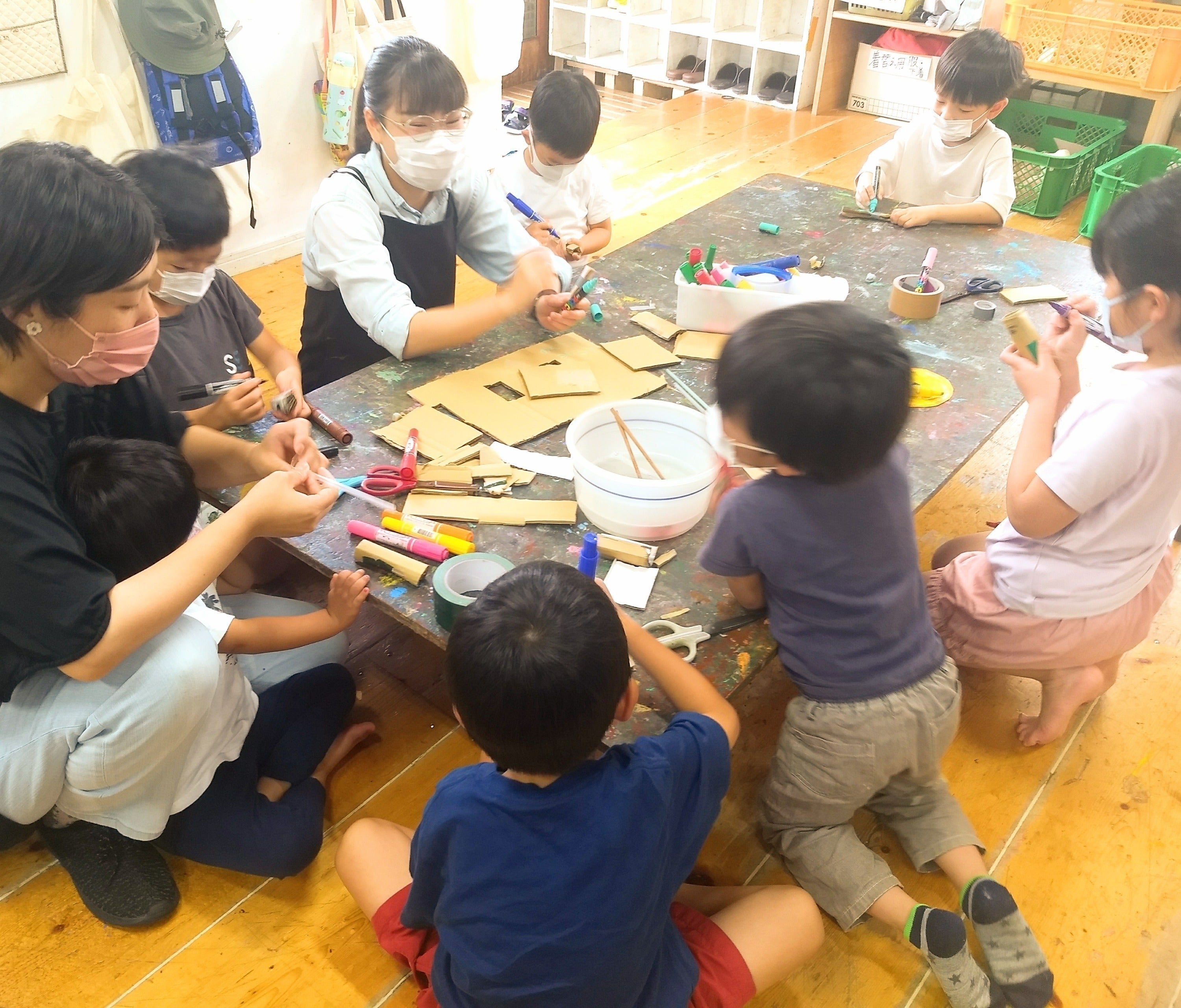 ぱれっと木だちは、2017年創作系日中一時支援としてスタート。絵画教室の生徒と交流しながら、自由に絵や工作をしています。創作活動に加え、自然体験や日常生活の自立支援を行い、生きることの楽しさを感じられるよう支援しています。