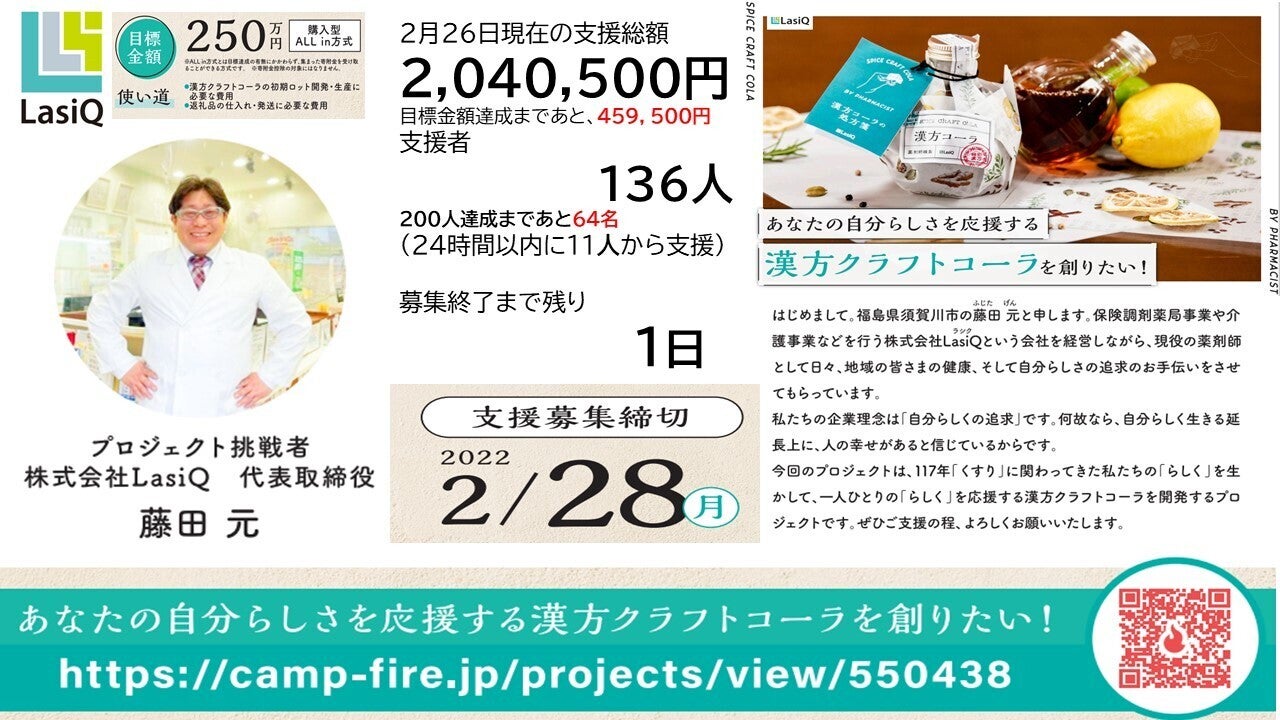 プロジェクトの成功、目標金額250万円の達成まであと2日を残し45万9千円までになりました。あともうひと踏ん張りです! ぜひ最後に今一度、プロジェクトをご友人やSNSにてシェアいただけますと幸いです。