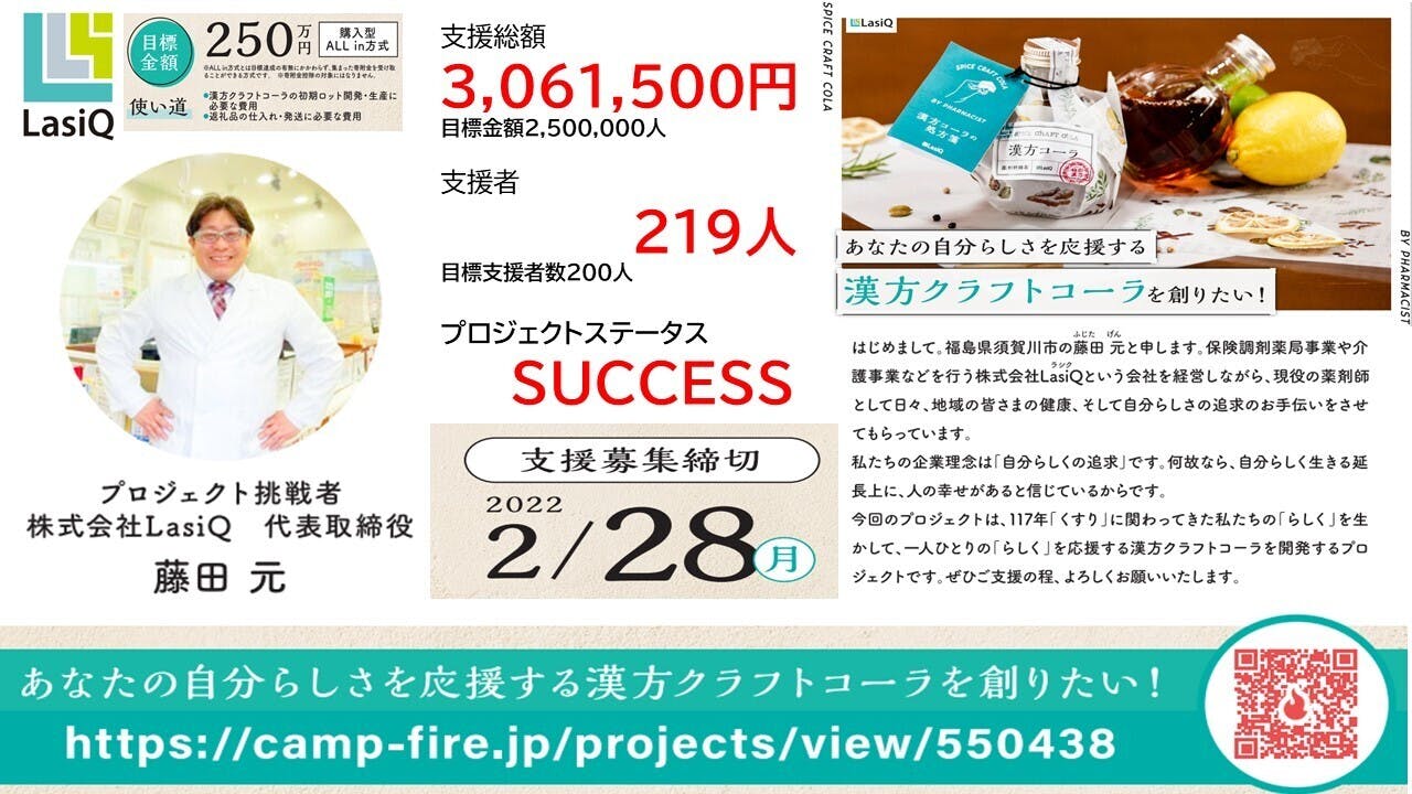 3月からは、新たにLasiQの中で開発チームを再編し、漢方コーラ開発を急ピッチで進め、6月末のお届けを目指して参ります。その進捗状況などにつきましては、都度支援者の皆さまに当サイトにて、また当社HPやSNSおよび開発者藤田元のFBにてご案内してまいります。