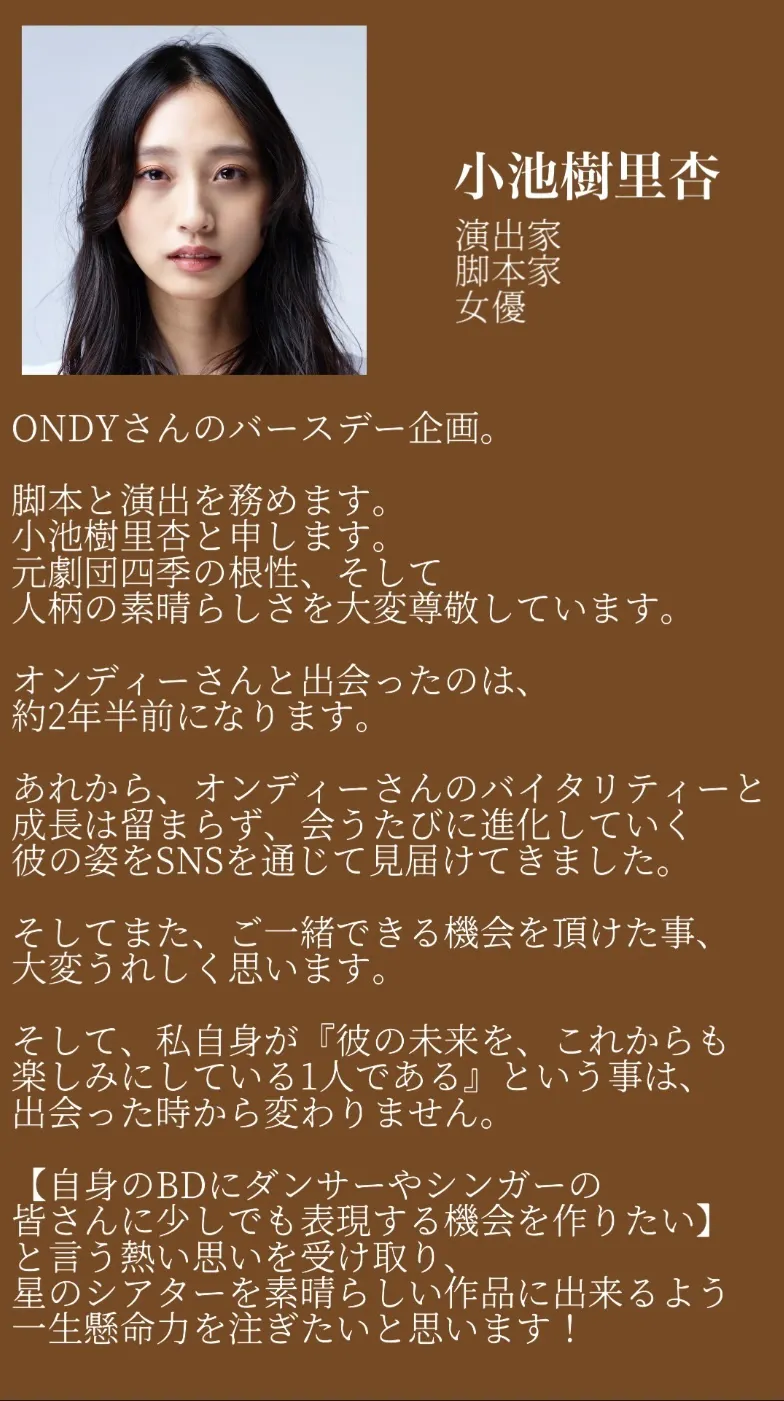 脚本は若手実力派の小池樹里杏さん、振付は主催のONDYが担当します。