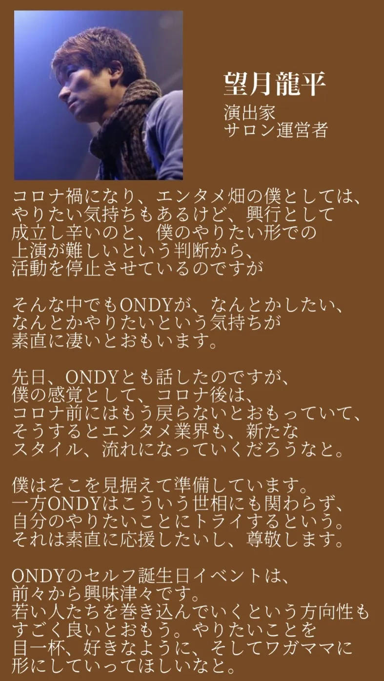 2022/03/19 18:45出演者を発表します!スペシャルゲストはここで初出しになります。スペシャルゲストは4人!!!フィギュアスケーターペアで世界選手権銅メダルなど活躍されていた高橋成美さん!CATSのあの曲を、ペアをONDYに変えてデュエットダンスさせていただきます!そして、ミュージカルダンサーとして数々のキャリアを残している永野亮比己くん。彼のダンスだけで今回観る価値があります。笑僕と劇団四季の同期にあたります。快く出てくれることになりました!カケフダタクローくんは、メディアの帝王と呼ばれており映像作品に数百本出ています。配信ということで、彼にお願いをしました。そして、おちゃさん。パフォーマーとして活躍の彼女はファンタジーの星のシアターに彩りを加えてくれます。他にも80名のオーディションを勝ち抜いたメンバーが出演いたします!一覧を載せますので、以下から、ご確認下さい!!-----CAST-----ONDY Special guest高橋成美(フィギュアスケーター)永野亮比己カケフダタクローおちゃ シンガー出演者谷中しおり伊東優 栗原彩夏照屋音色 山田未来葛西菜々 桶田瑞紀宍倉明歩 藤村希 ダンサー出演者yuineAnjiYUNA 菅原千春 野田菜月 寺内愛莉 山岸美月 浅野杏奈 渡邊花鈴 澤田樹璃 RYOKO もっと見る