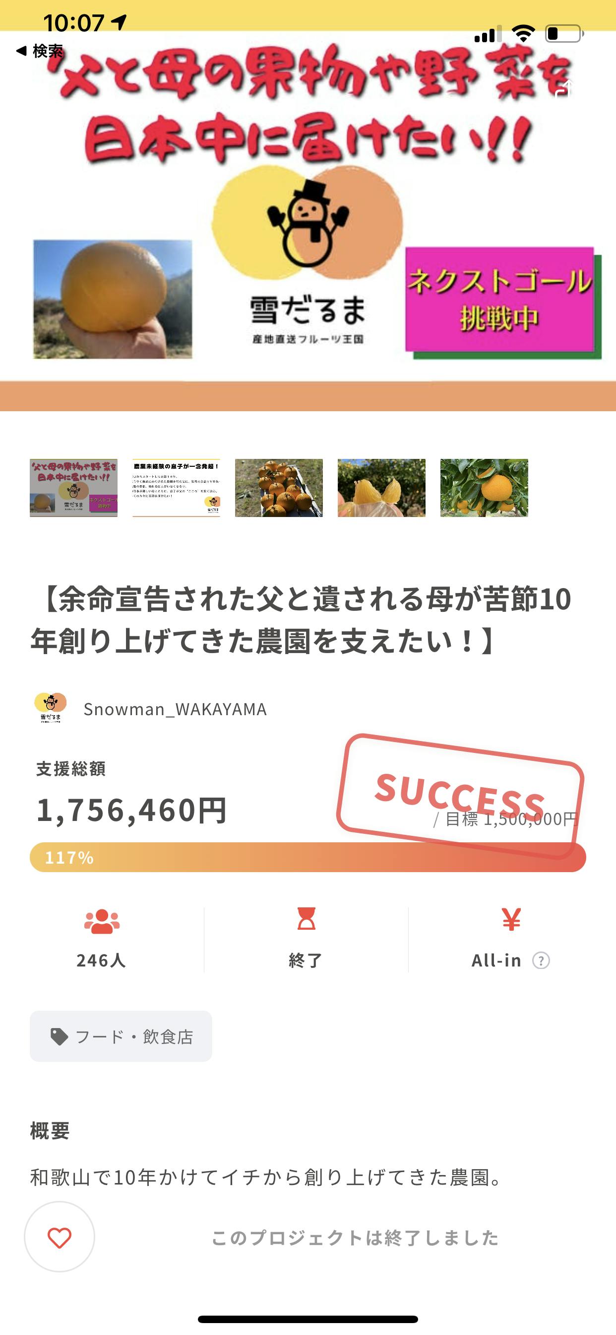 2022/03/14 10:16昨日で本プロジェクトは無事終了いたしました!本当にたくさんのみなさまのご支援のおかげです。余裕があればお一人おひとりに直接お礼をお伝えしたいところですが、今はまだなかなかそれもかなわず。いつの日か必ず、と思っています。もちろん、季節のフルーツを始め、これからリターン品をお送りする方々はまだまだお楽しみにお待ちいただければと思います。タイトルにもある通りいただいたご支援をもとにここから計画的にさまざまな準備、そして運営をしていく所存です。そしてまたたくさんのみなさまに喜んでいただける果物、野菜を実らせたいと思っています。このページからはご支援いただけませんが、もし気に入っていただけたなら今後も我が家の農作物をみなさまにお買い求めいただけるように準備をしますので、またどうぞご愛顧いただければと思います!!(どうやら、このページをカスタムすることも可能なようです!!お待ちくださいね。)まずは御礼まで。阪本健悟 もっと見る