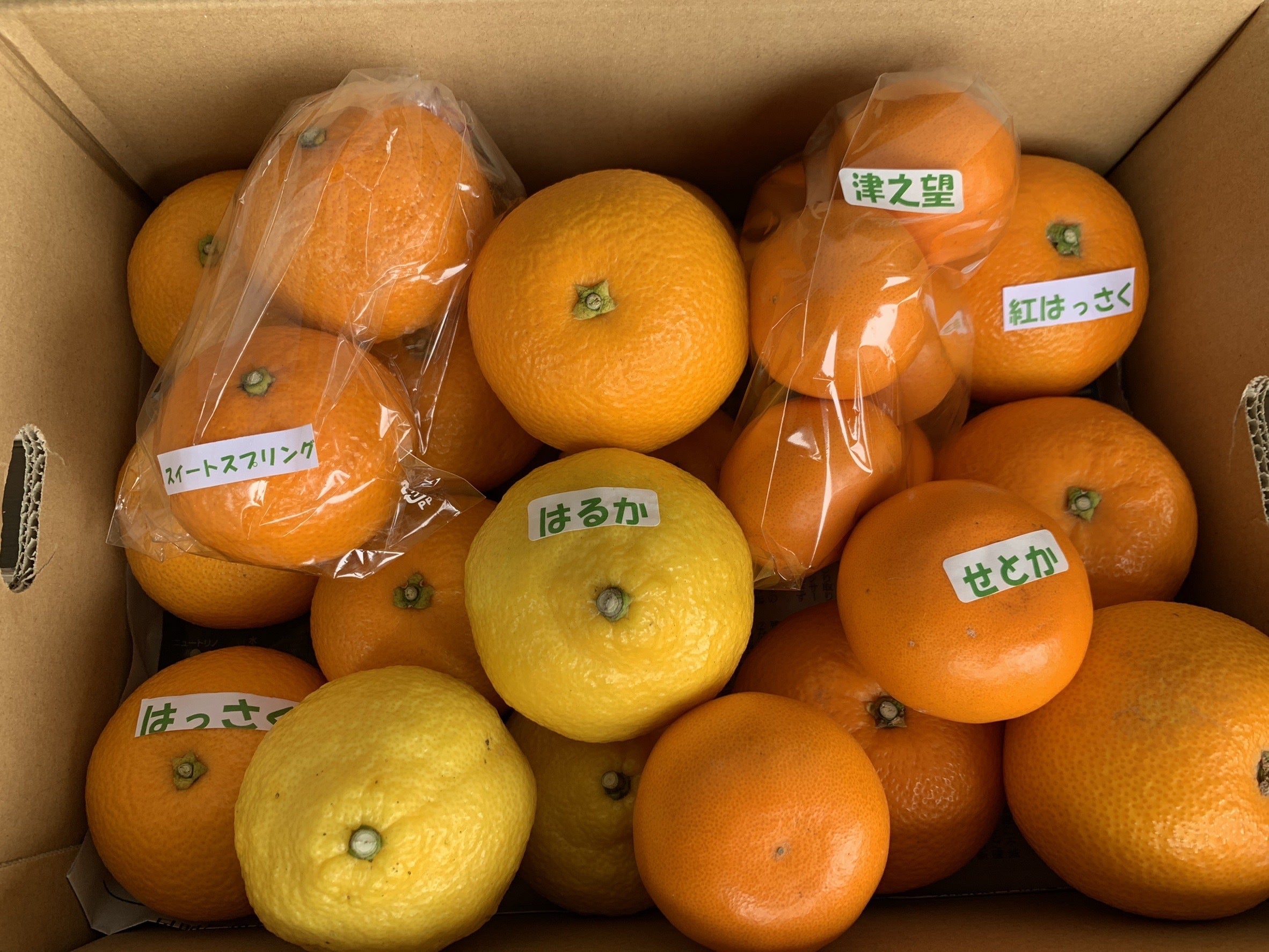 はっさくのみを箱に詰めるのとは異なり、さまざまな種類の柑橘を詰め合わせるのはなかなかに骨が折れますね汗。ただ詰めるだけでなく、きれいに入れた方が開けたときの「わぁ」という感動も違うだろうということで、ひとつずつ母がていねいに入れなおしてくれました。