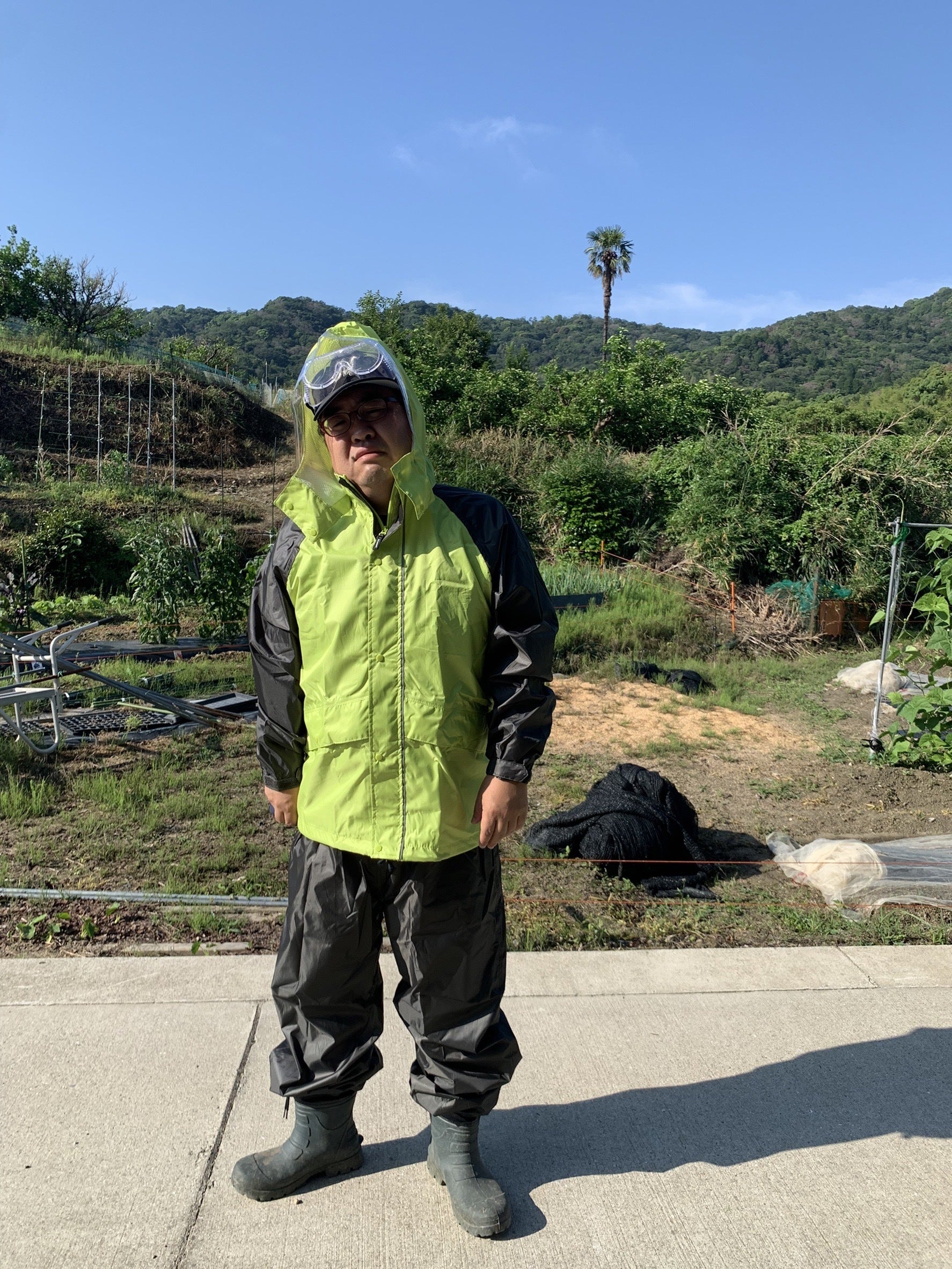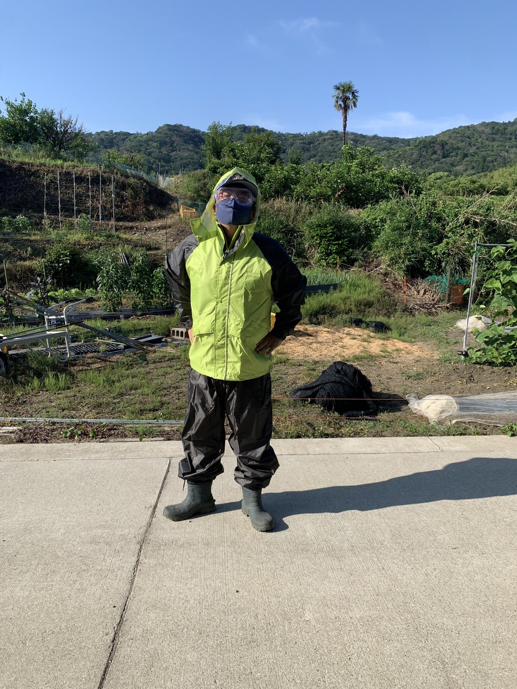 完全防備で消毒作業もしております。まあ暑い暑い。