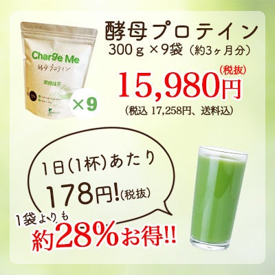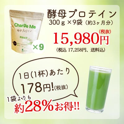 ・原材料:酵母プロテイン濃縮物(国内製造)、大麦若葉粉末、イヌリン、抹茶粉末、加工黒糖、デキストリン、パン酵母粉末(ぶどう糖、マンガン含有酵母、その他)、ザクロ濃縮果汁、枸杞の実エキス、マルトデキストリン、乳酸菌末/甘味料(ステビア)、香料、乳化剤、V.C、ナイアシン、V.E、パントテン酸、V.B2、V.B1、V.B6、V.A、葉酸、V.D、V.B12、(一部に乳成分・大豆を含む)