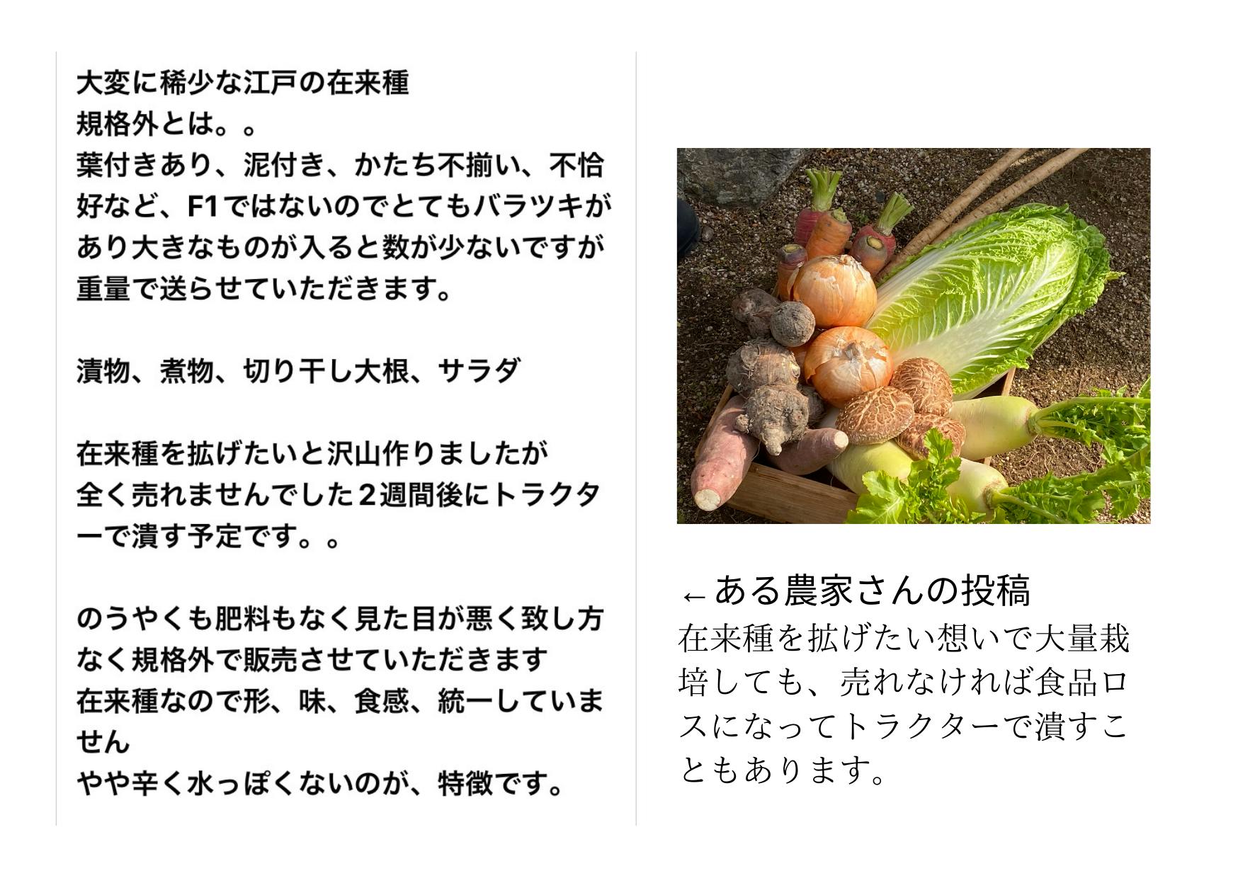 → 多種多様野菜のセット売りでふぞろいの野菜も販売可能。