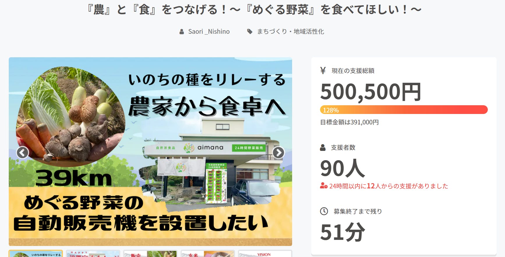 2022/03/28 11:00こんにちは!aimana代表の西野です♪当プロジェクトをご覧いただきありがとうございます。皆様の温かいご協力の末、こちらのプロジェクトは終了とさせていただきますm(_ _)m宣言の通り、これから農家の方からのお野菜を直接届けるための自販機の設置を進めていき、その成功事例を元に日本中に活動拠点を作ってまいります。もちろん皆様への返礼品もこれから順次発送いたします!こうして、支援者の方とのつながりを持つことができたのが今回のプロジェクトの一番の成功だったとしみじみ感じております。※通常のオンラインストアと異なり、用意が整い次第発送となります。予めご了承ください。全国展開に向けて、また今後もプロジェクトを投稿することがあると思います。その時はぜひご協力お願いしますね!▼当プロジェクトのURLです。https://camp-fire.jp/projects/550593/activities/361657 もっと見る