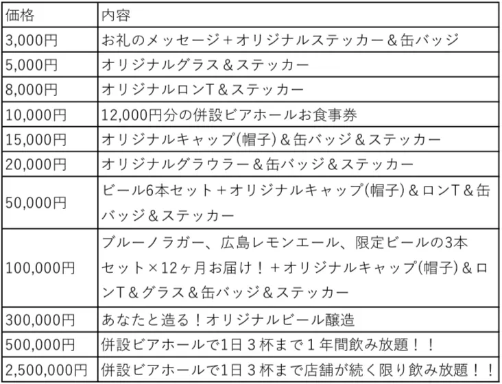リターンは金額に応じて以下の内容でご用意させていただいております。