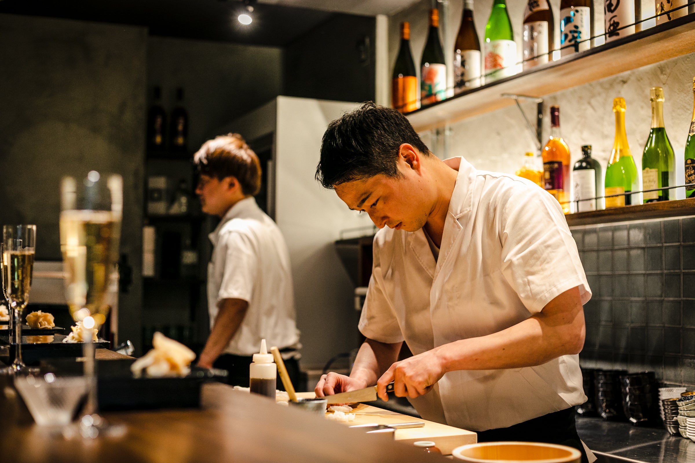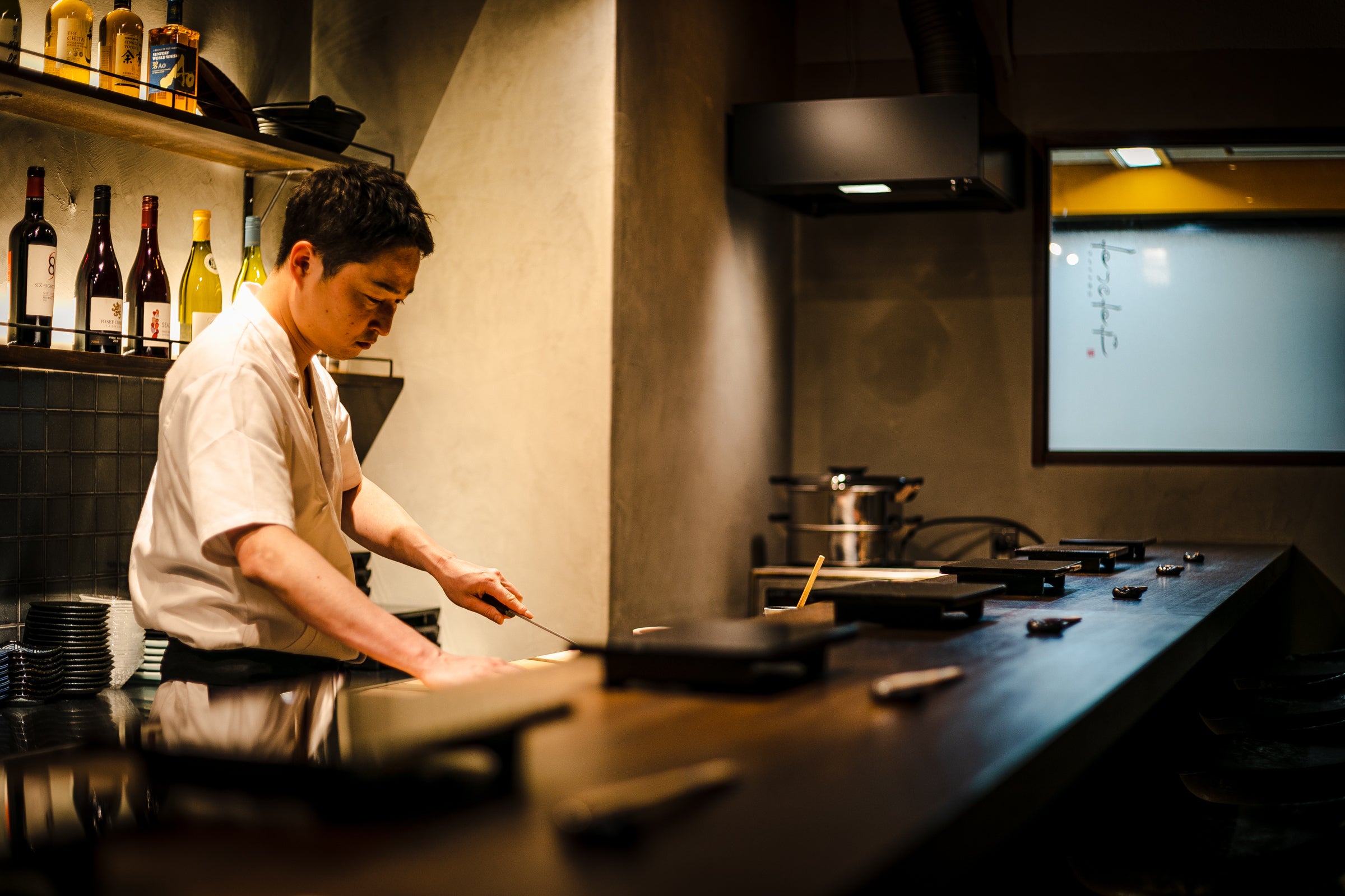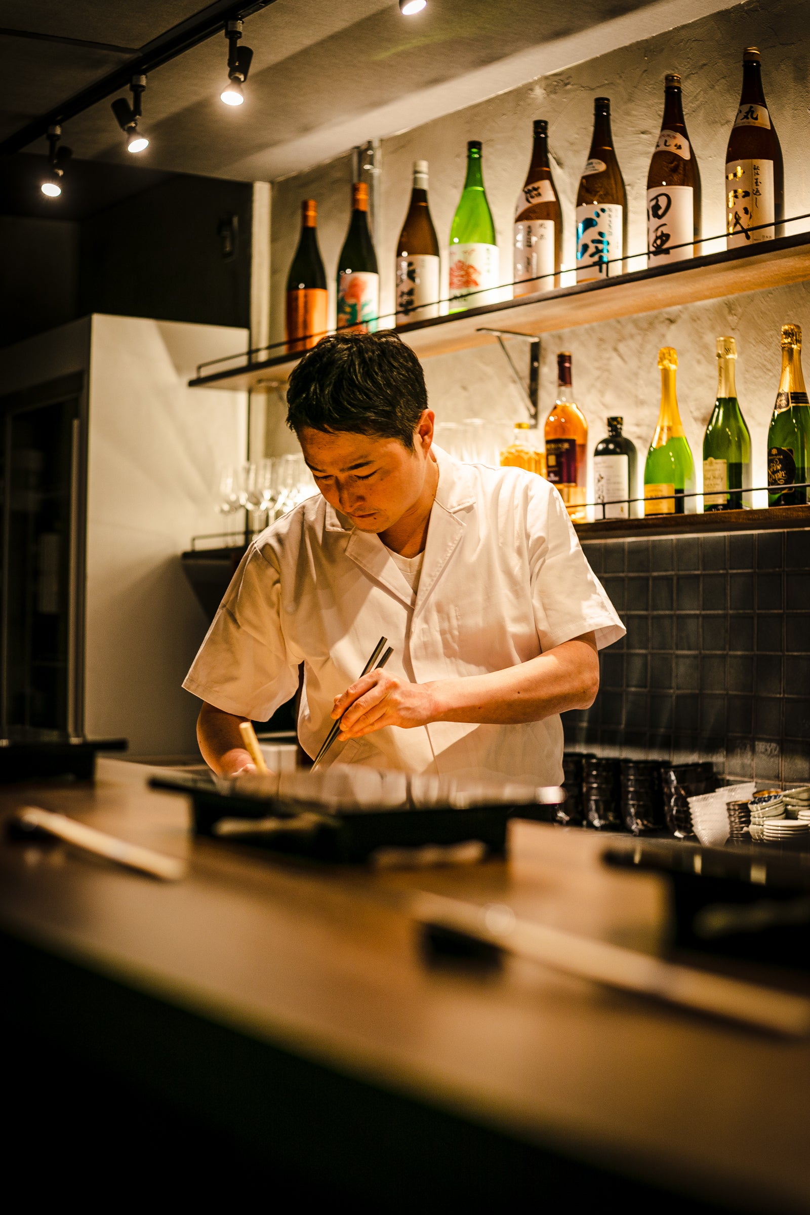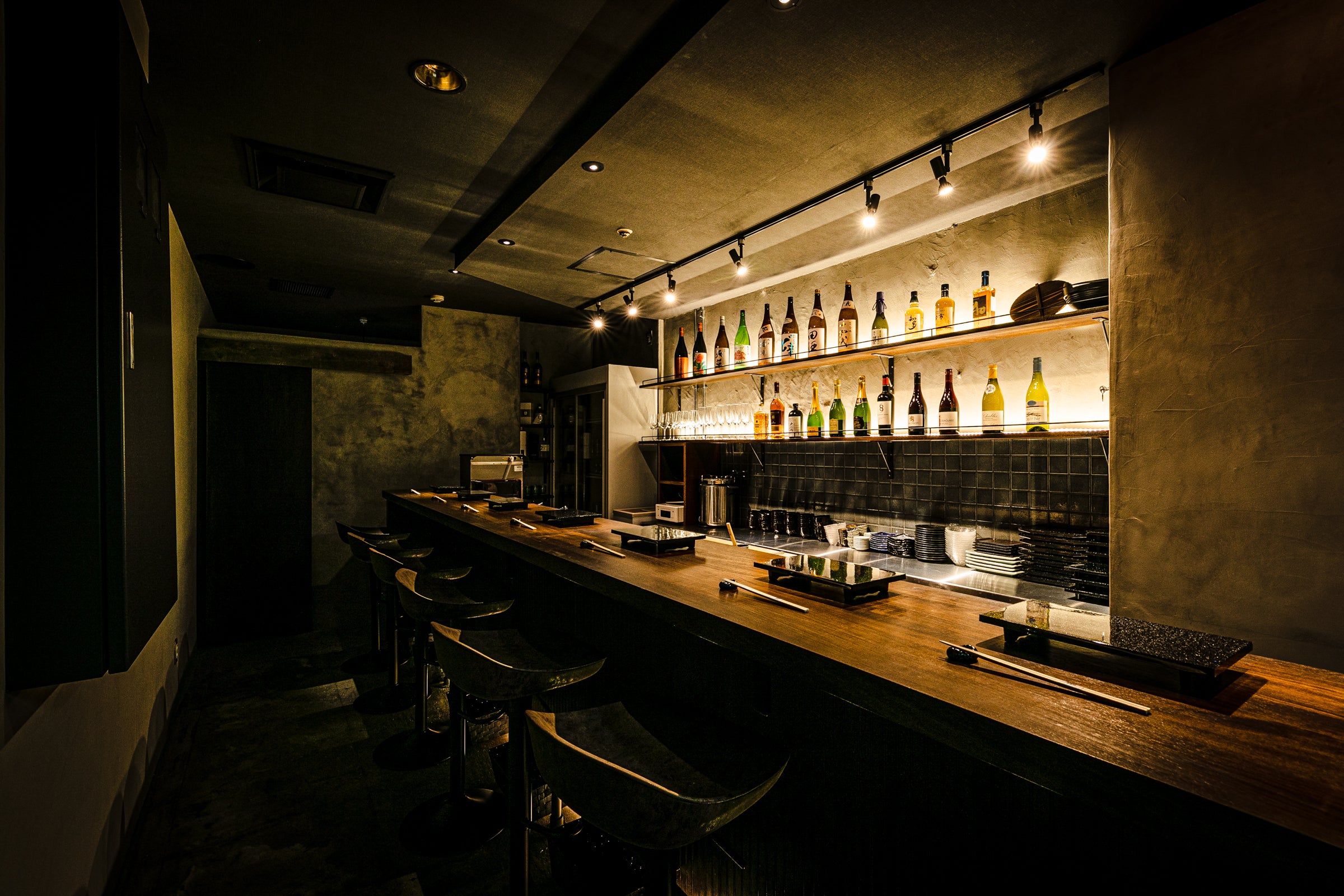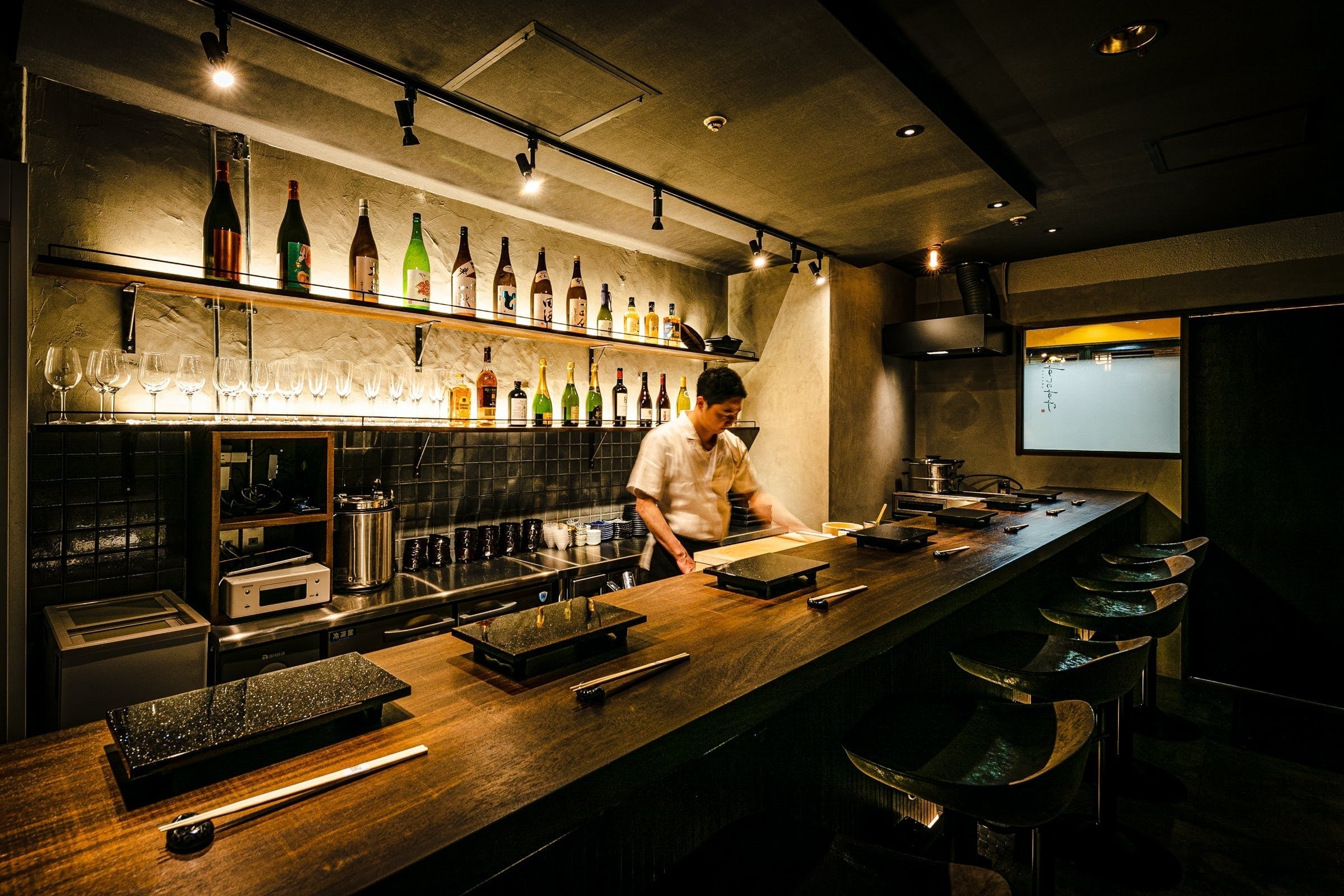 すりガラスの扉の先には、わずか8席のカウンター。限界まで落とした照明とは対照的に、ピンスポットで輝く壁一面にずらりと並ぶ日本酒やワインボトルの数々―。
