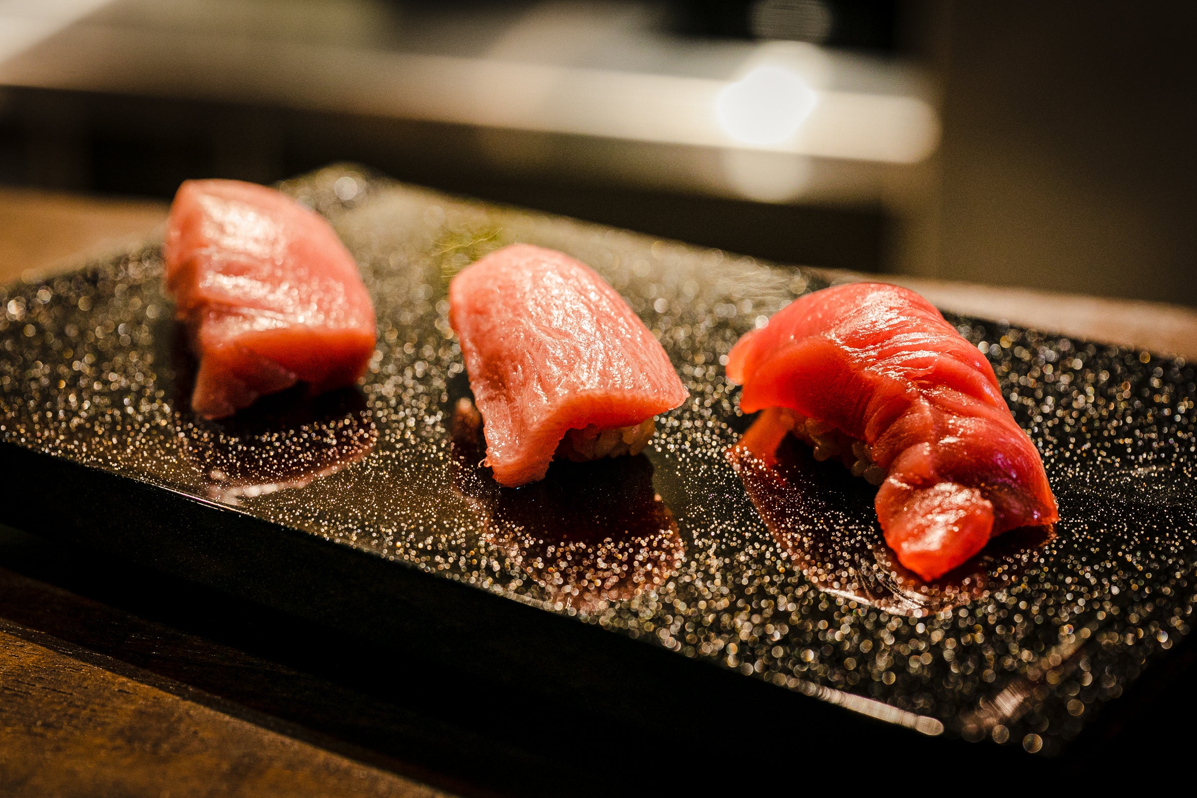 マグロは本マグロ、南マグロ、インドマグロなど、希少部位を取り入れながら3貫ご用意。仕入れによってメニューは変わり、その日ごとに厳選した部位を3貫握ってご提供します。