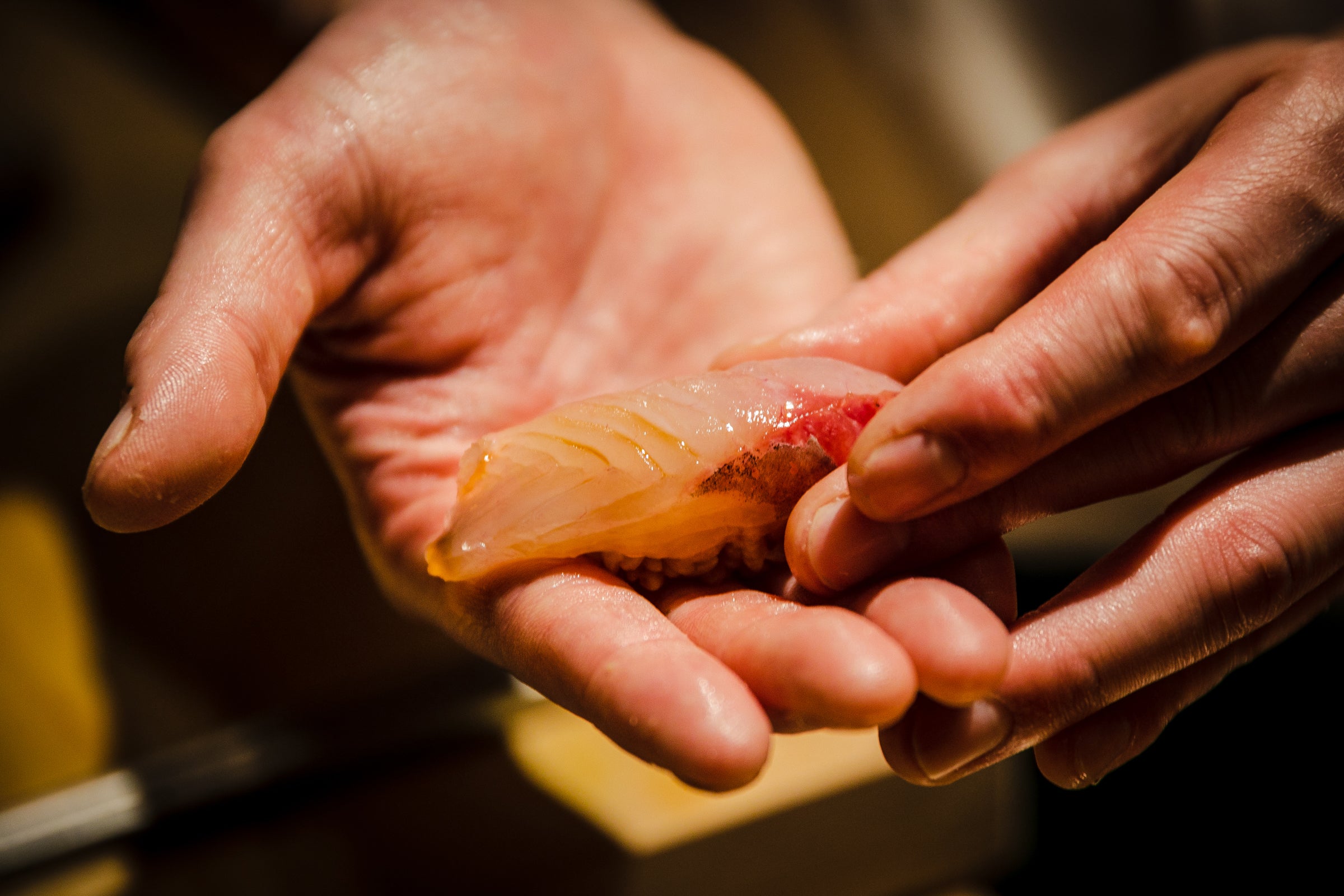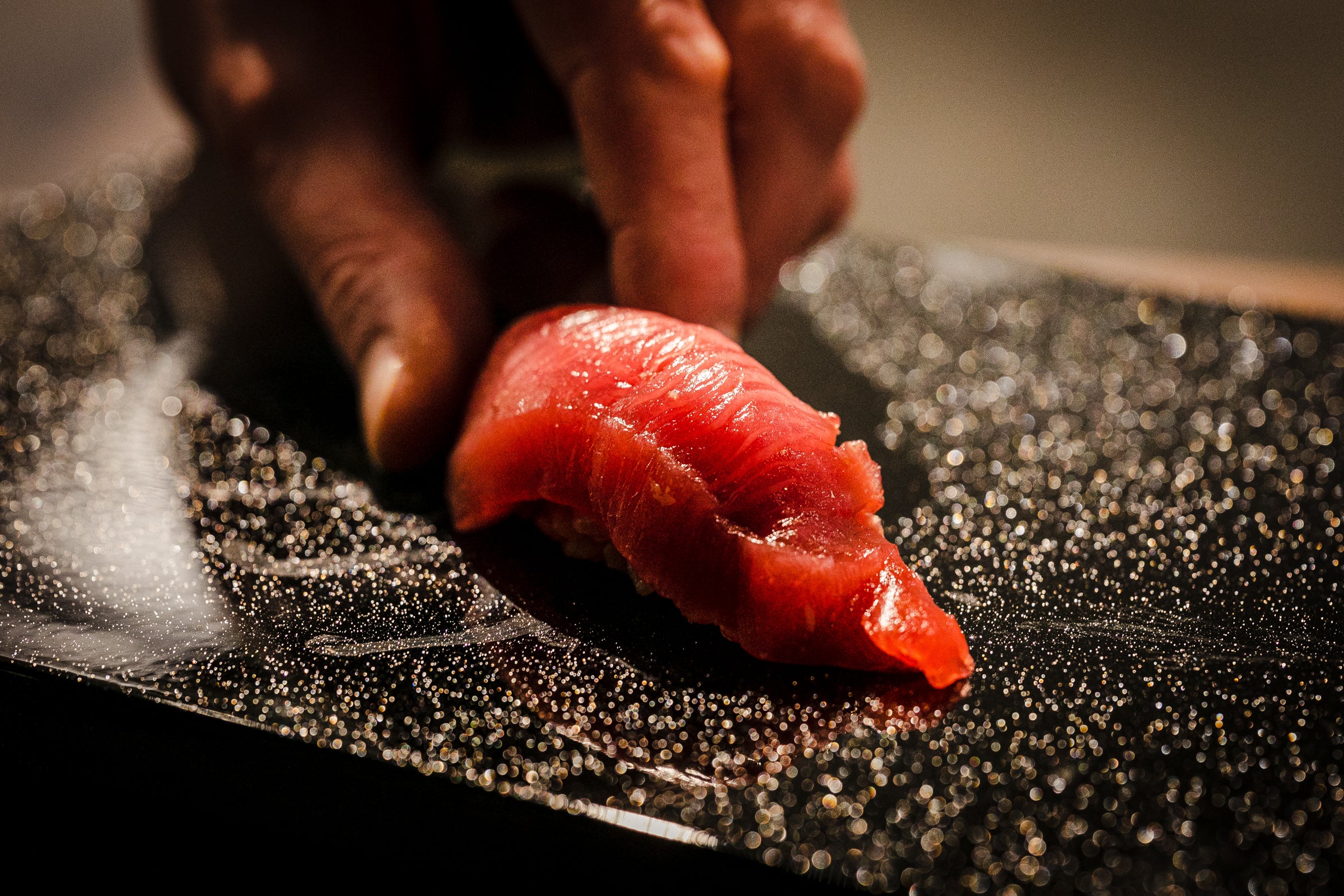 「いかにも寿司屋っぽい雰囲気ではおもしろくない。暗めのトーンでまとめ、ファッショナブルな雰囲気のなかで握り寿司を楽しんでほしかった」―大将はそう語ります。