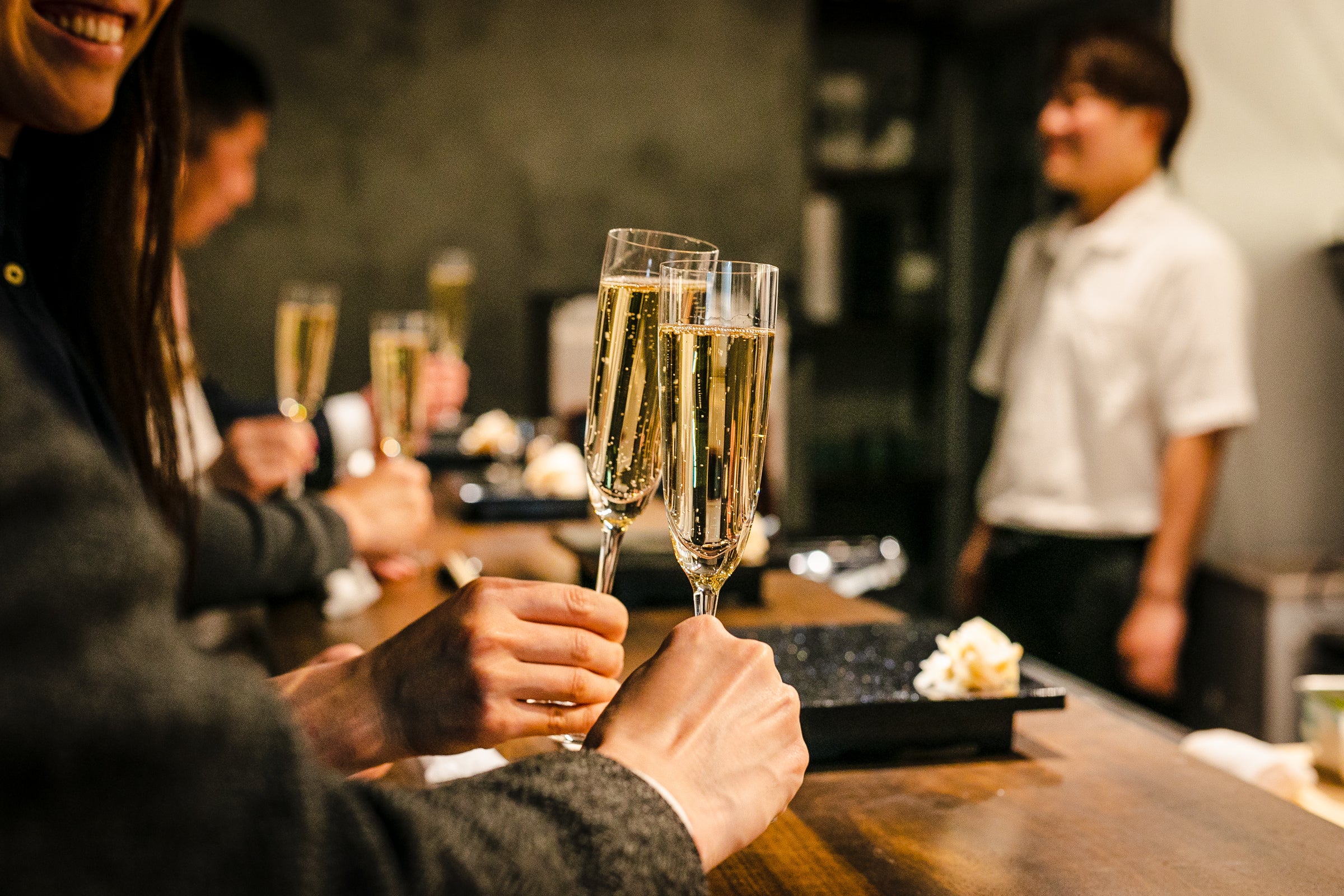 日本酒は10種類程度、シャンパンやスパークリングワイン、赤・白ワイン、ハイボールなどさまざまなメニューを用意しており、お客様のお好みに合わせてグラス1杯からご提供します。