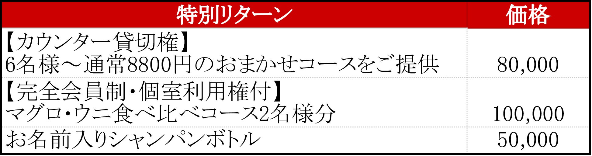 通常は全20品、8,800円のおまかせコースのみのご用意ですが、今回は開店を記念して、CAMPFIREの支援者様限定でマグロとウニを産地ごとに食べ比べできる特別コースをご用意しました。