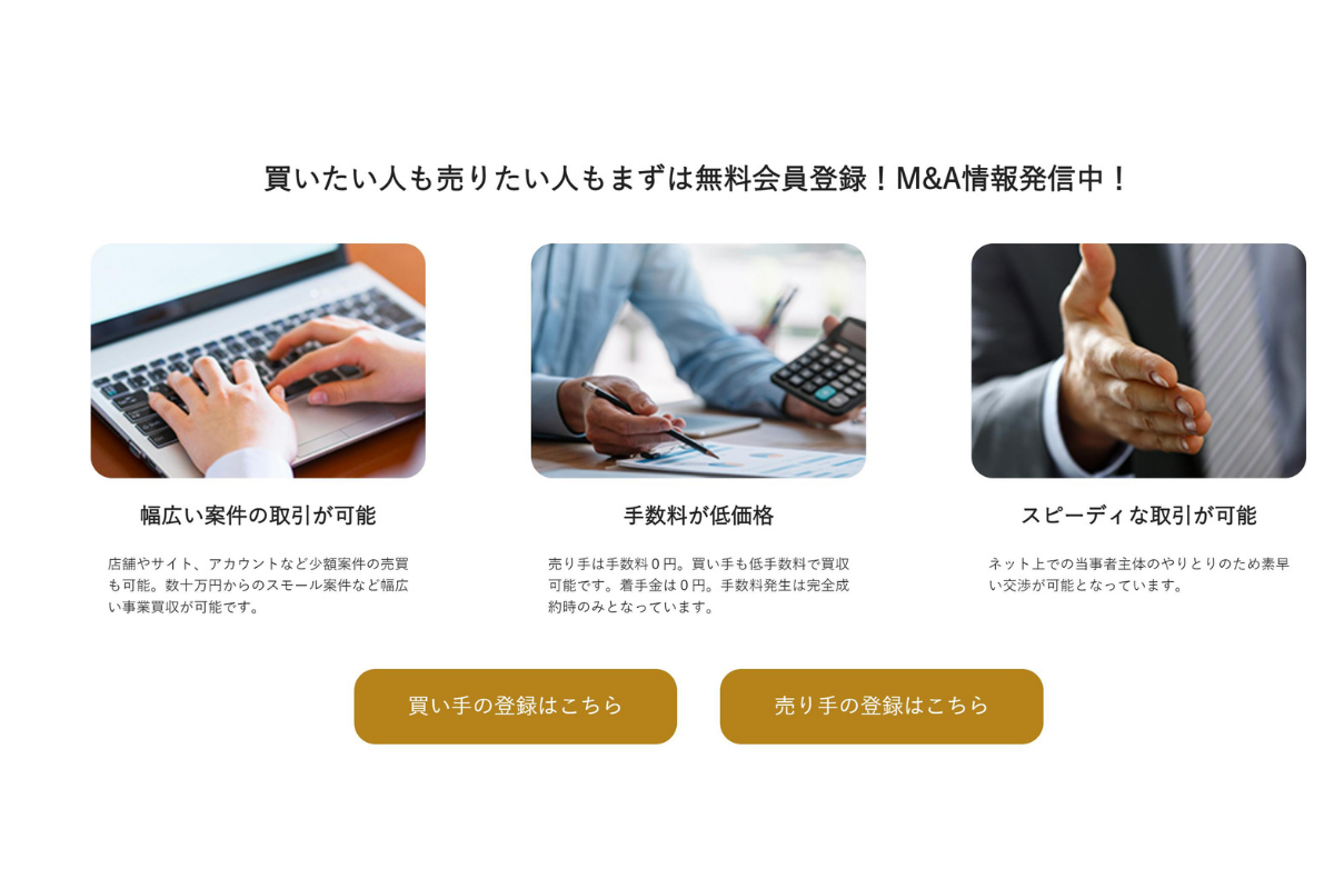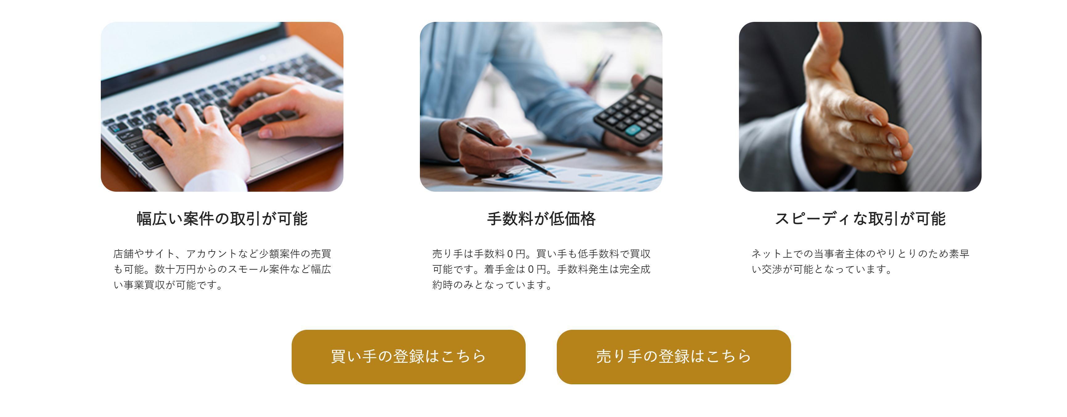 など、個人が所有している小規模案件中心に取り扱うため、売り手と買い手との間で売買しやすい案件が豊富です。
