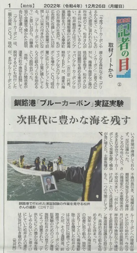 12月26日付の釧路新聞に釧路港でのブルーカーボン実証実験の記事が紹介されました。