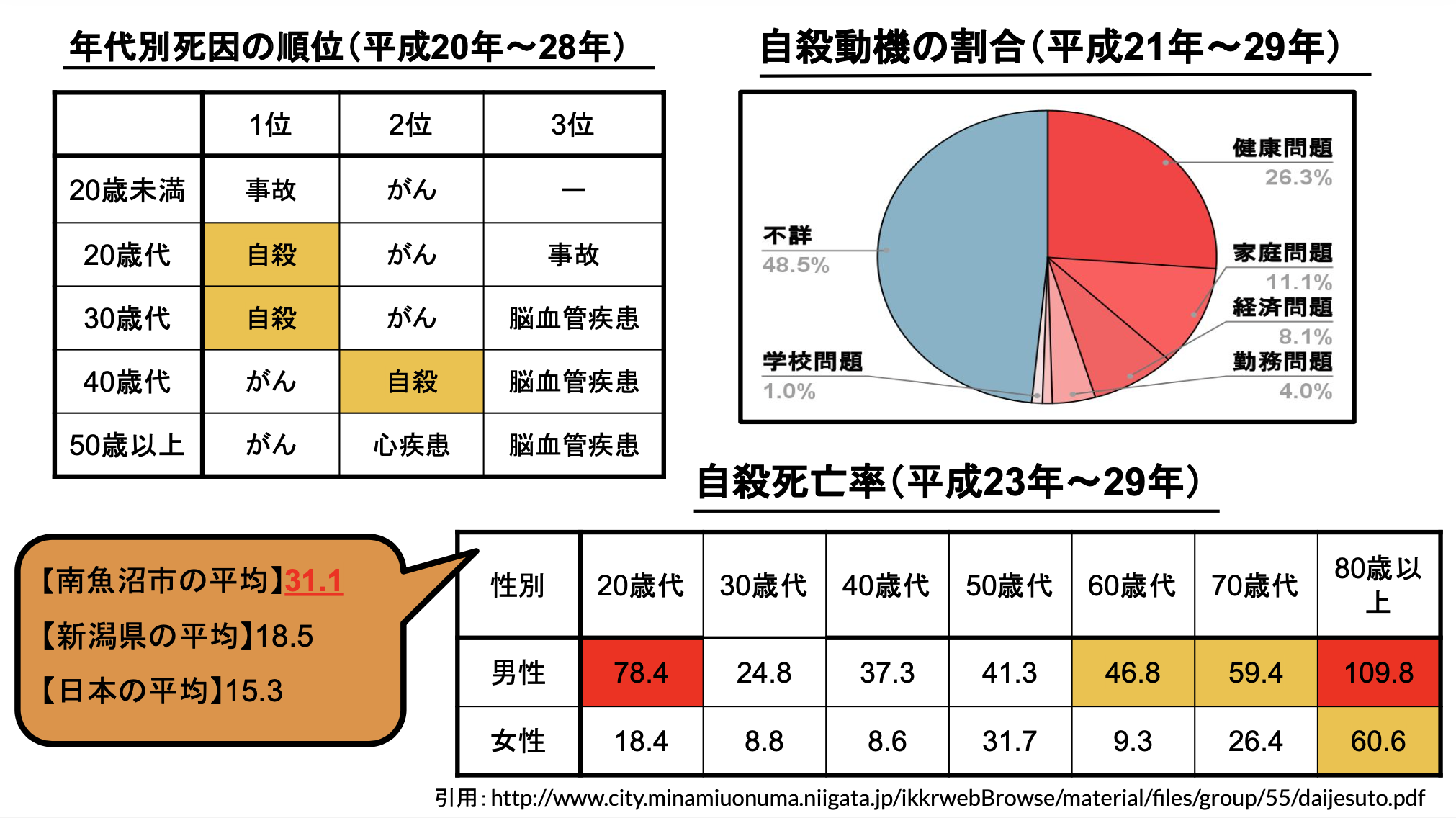 南魚沼市の自殺死亡率は全国平均の15.3%と比べると2倍も高くなっています。年代別にみると20代が78%以上ともっとも多く、60代から70代のシニア層にも多いことがわかります。自殺の動機としては健康問題が26%、次に家庭問題と続きます。