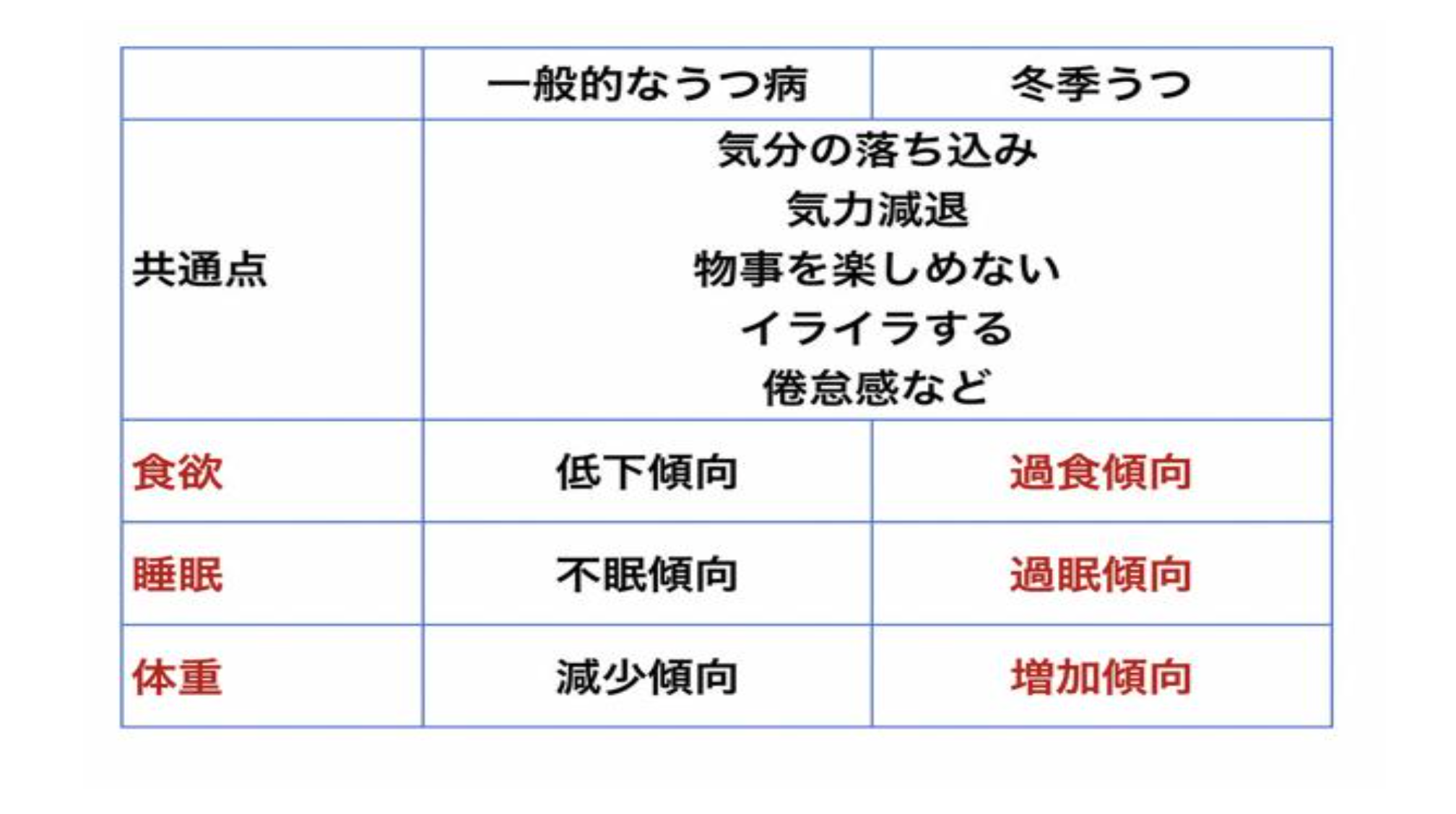 食欲・睡眠・体重の変化に注目すると、一般的なうつ病の症状とは真逆の「食欲が増し体重が増えたり、たくさん寝てもいつも眠たい」などの症状が出ることがあります。このことが雪国うつの発見を遅らせてしまい治療が遅れ、最悪のケースに至ってしまう原因のひとつではないかと考えました。