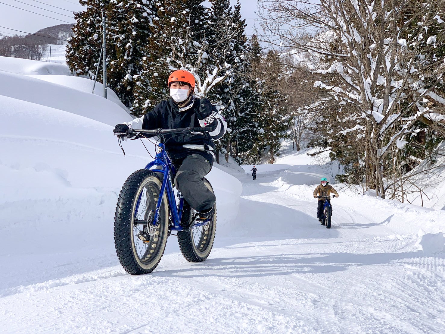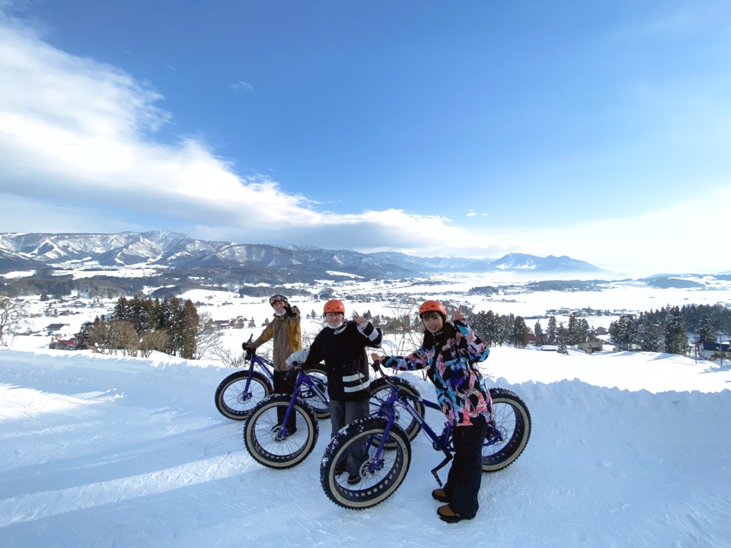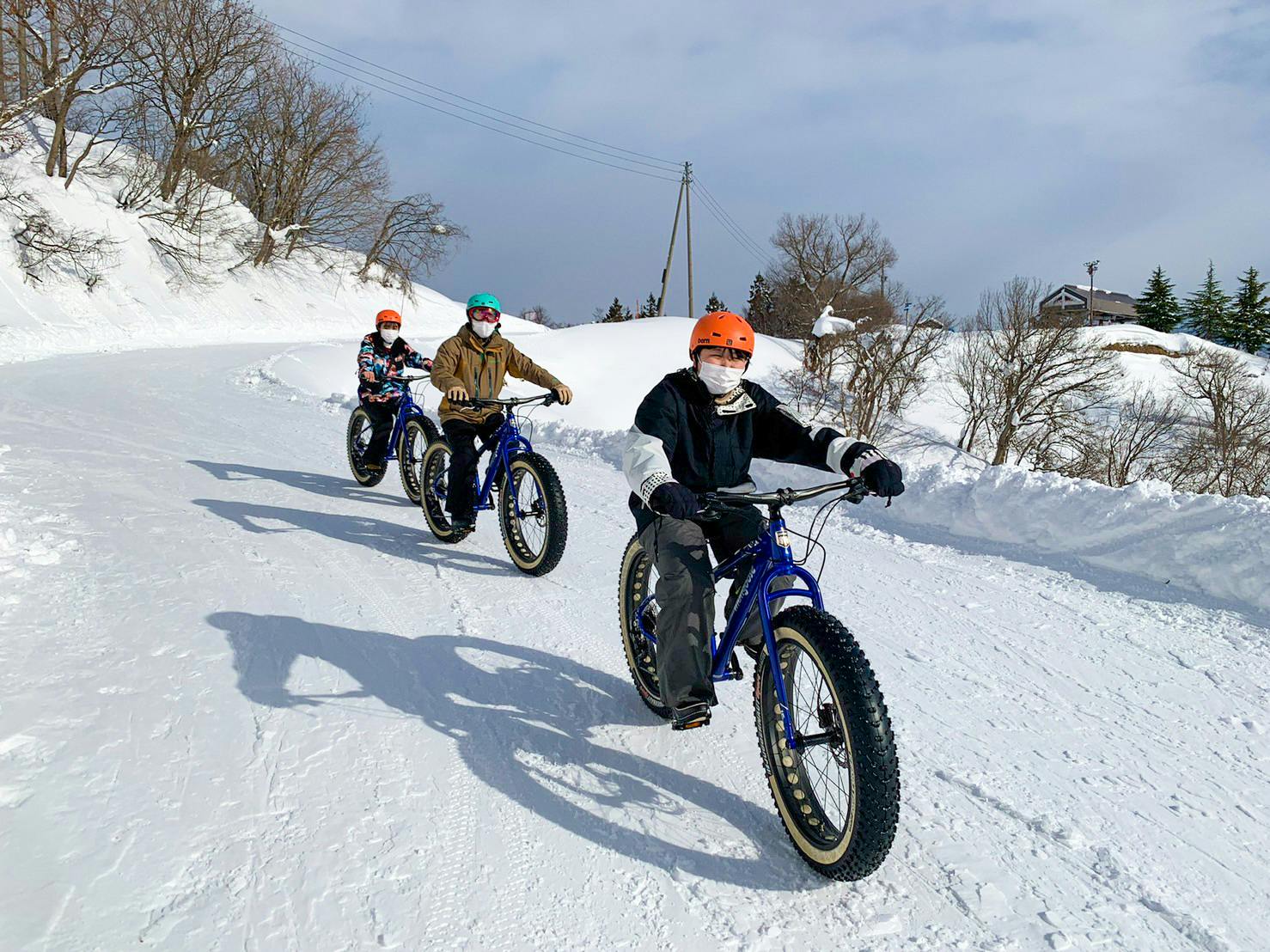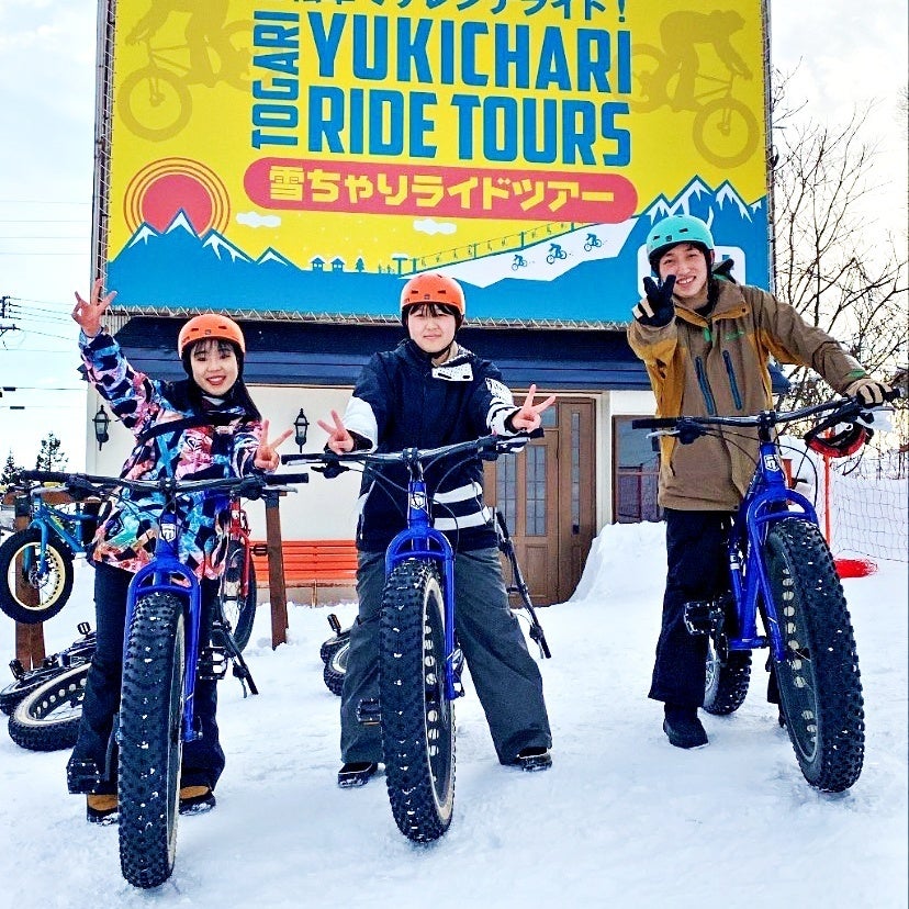 スキー場では「雪ちゃりスノーライドツアー」という雪上自転車の体験ツアーを行なっています。当日はお天気も最高で、真っ白なゲレンデを雪上使用の太いタイヤを装備したファットバイクで疾走する気持ち良さは言葉にできません!