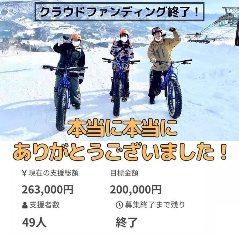 2022/02/14 14:342月12日をもちまして、クラウドファンディングが無事終了いたしました!ご支援・ご協力してくださった皆さん、本当ありがとうございました!!支援金額 263,000円支援者数 49人沢山の方からご支援を頂き、なんと開始3日で目標金額である20万円を達成し、結果として目標金額を大幅に達成することが出来ました!本当に皆様のおかげです。本当に本当にありがとうございました!!皆様から沢山の応援・ご支援を頂けて、最高に嬉しく、また心温まる14日間でした。私達の活動は地域の方々や周りの方々に支えられてるのだと改めて実感しました。今回集まった資金は、雪国うつを改善するイベント、また夏季のファットバイクを使ったイベントを南魚沼で開催するために活用します。3月のイベントでは『雪』や『自転車』の魅力を広め、多くの方に楽しんで頂けるイベントを必ず作り上げます!ぜひ大原運動公園に遊びに来てください。kikkake一同今後も全力で頑張っていきます。これからもどうぞよろしくお願いいたします!リターンお楽しみに〜!!! もっと見る