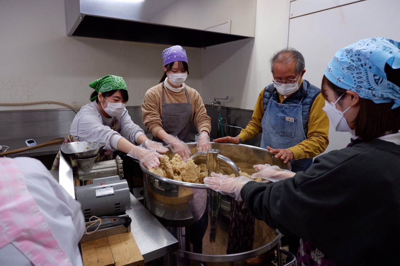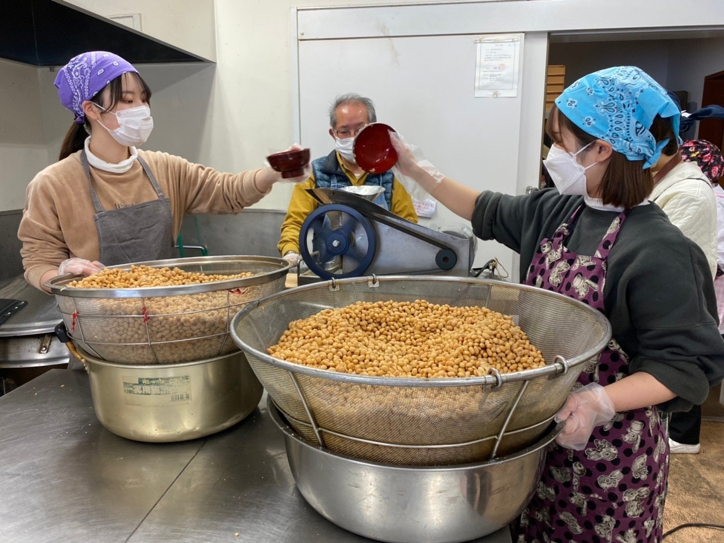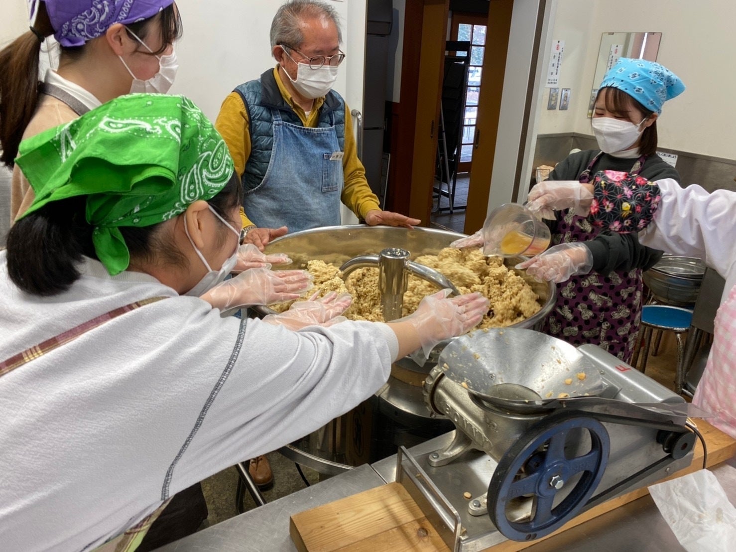 まず芦川産の大豆15㎏を茹で、ミンサー(ひき肉を作る際にも使われる)を使って大豆をミンチ状にします。味噌に使われる大豆をそのまま茹でたものと砂糖漬けにしたものを味見させていただきました!芦川の清らかな水で育った大豆は、雑味がなく噛めば噛むほど大豆本来の甘みが増してとてもおいしく、次から次へと手が止まらなくなりました!この大豆を茶碗を使って撹拌機に投入するのですが、背伸びをしながら作業をしていた私に地域の方が踏み台を用意してくださったことが印象的でした!