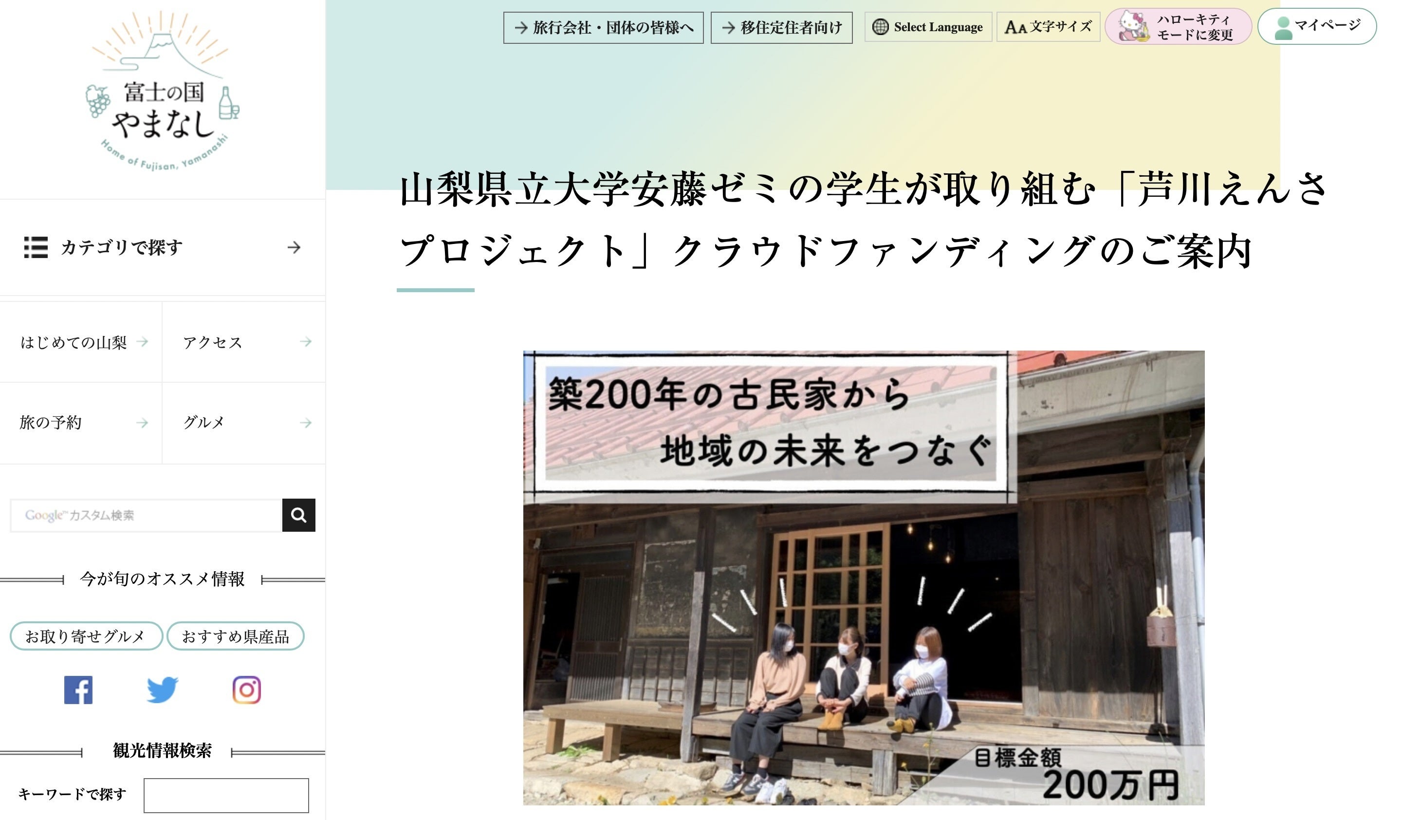 クラウドファンディング公開から5日目を迎え、第一目標としていた達成率30%を突破することができました!毎日たくさんのご支援、応援メッセージを頂いております。本当にありがとうございます。この度、山梨県の観光情報を発信する「富士の国やまなし観光ネット」のトピックス欄に、当プロジェクトの取り組みを掲載して頂きました!→https://www.yamanashi-kankou.jp/fuefuki/topics/ashigawaensaproject.html学生メンバーのみではプロジェクトの周知に限界がある中で、山梨県内外の多くの方にご覧頂ける場に掲載して頂き、メンバー一同深く感謝申し上げます。目標達成にはまだ程遠い状態ですので、今後とも当プロジェクトへのご支援、ご協力を頂けますと幸いです。明日は1年生のメンバーである横山ちゃんから活動報告があります!プロジェクトへの熱い想いを持った彼女からの投稿を、楽しみにしていてくださいね!