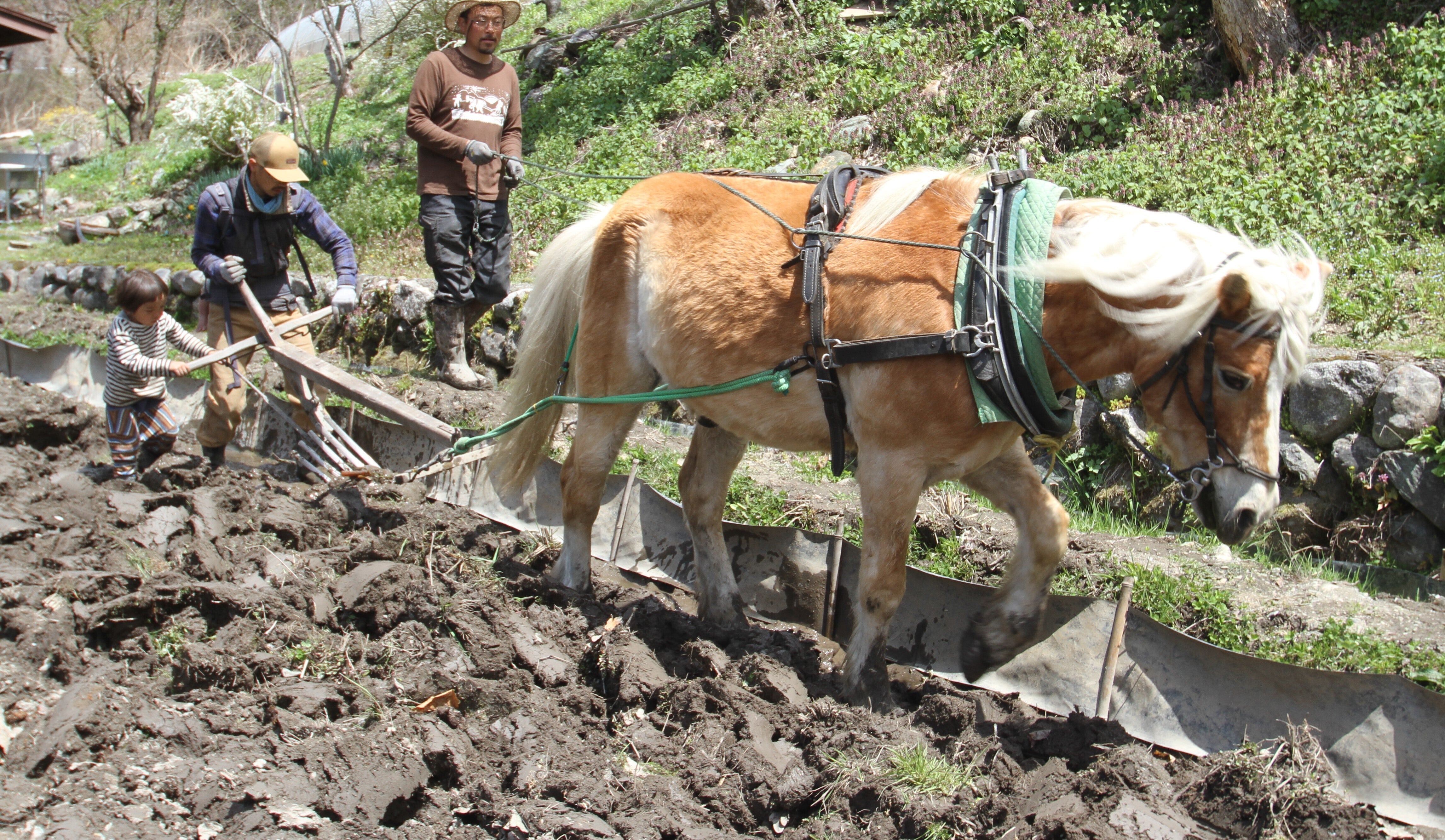 私たちは信州高遠で、農耕馬のビンゴ(ハフリンガー種19歳・雄)とともに、田畑を馬で耕す「馬耕」と山の木を運ぶ「馬搬」に挑戦して10年経ちます。