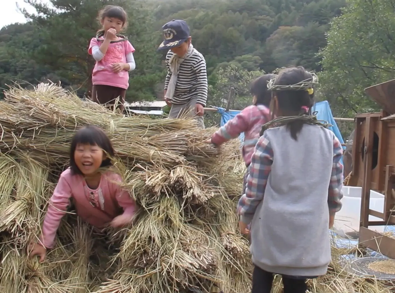 <脱穀で出た藁の山で遊ぶ子どもたち>