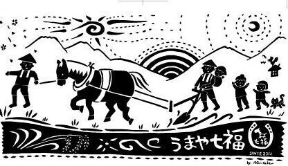 のりたけ(紀子)デザインの、家族で馬耕をしている切り絵風の絵柄です。