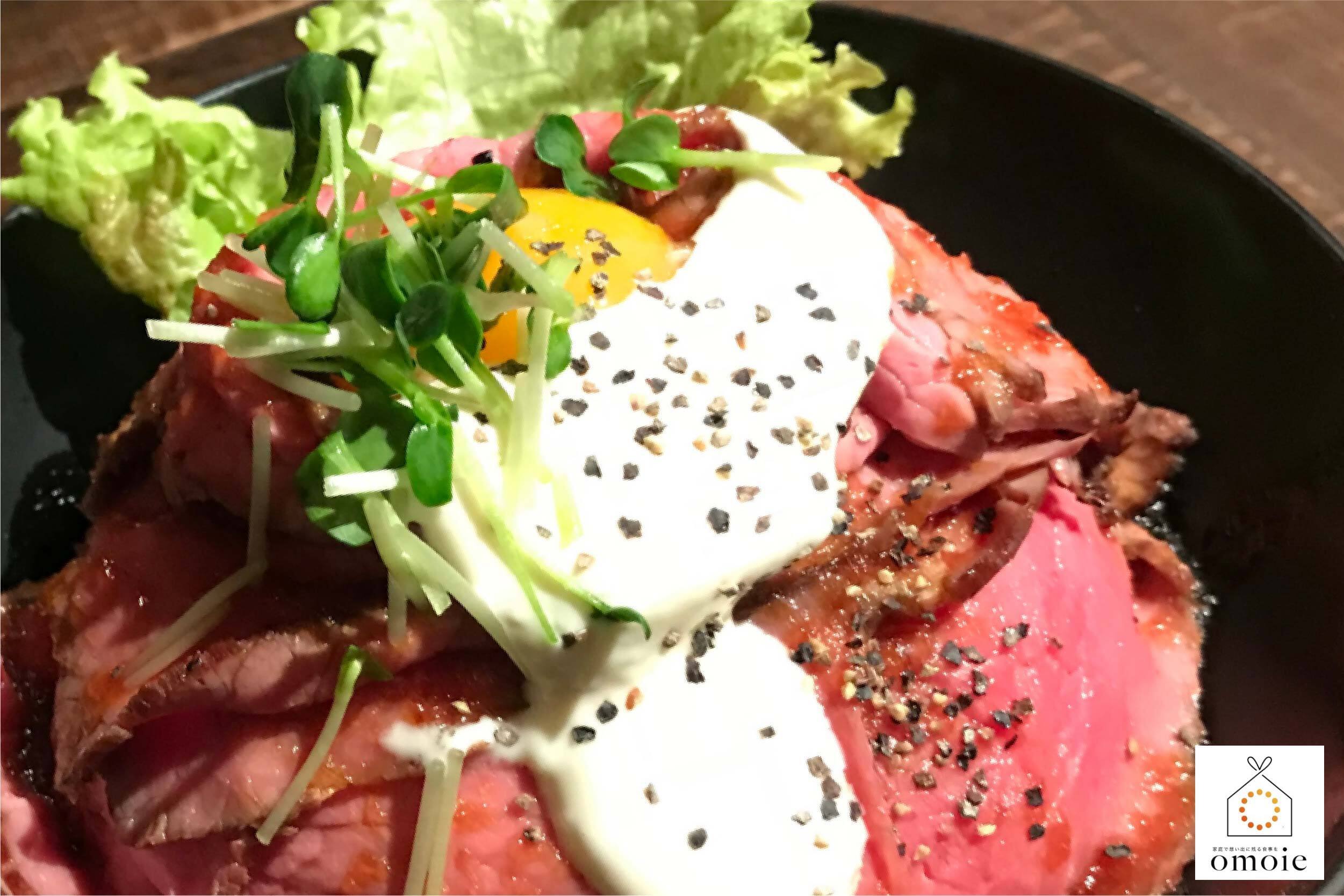あつあつのご飯に薄切りのローストビーフをのせ、卵黄をのせたら憧れのローストビーフ丼の完成です。