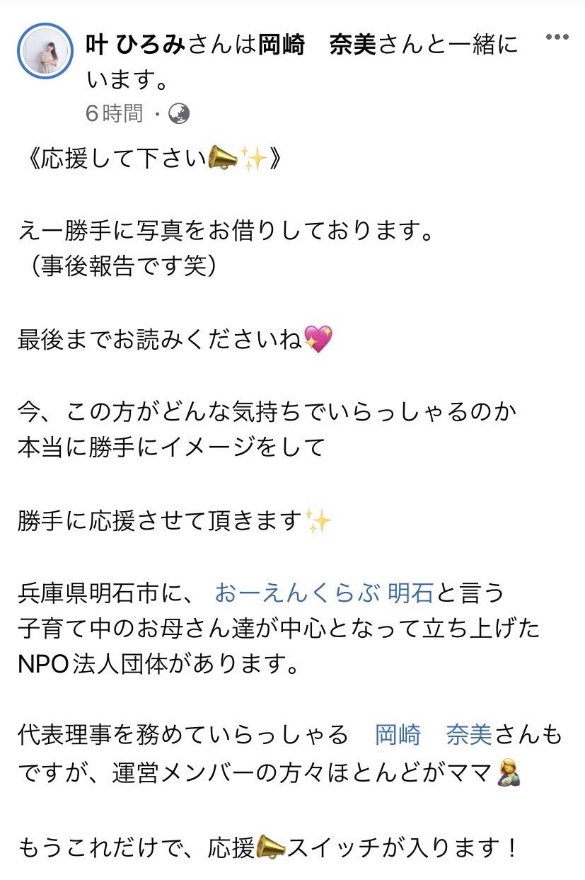 昨日、神戸の女性起業家さんが、Facebookで応援投稿してくださいました。