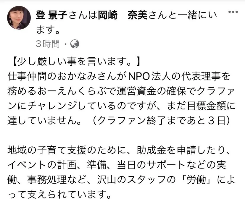 仕事仲間のおかなみさんがNPO法人の代表理事を務めるおーえんくらぶで、運営資金の確保でクラファンにチャレンジしているのですが、まだ目標金額に達していません。(クラファン終了まであと3日)