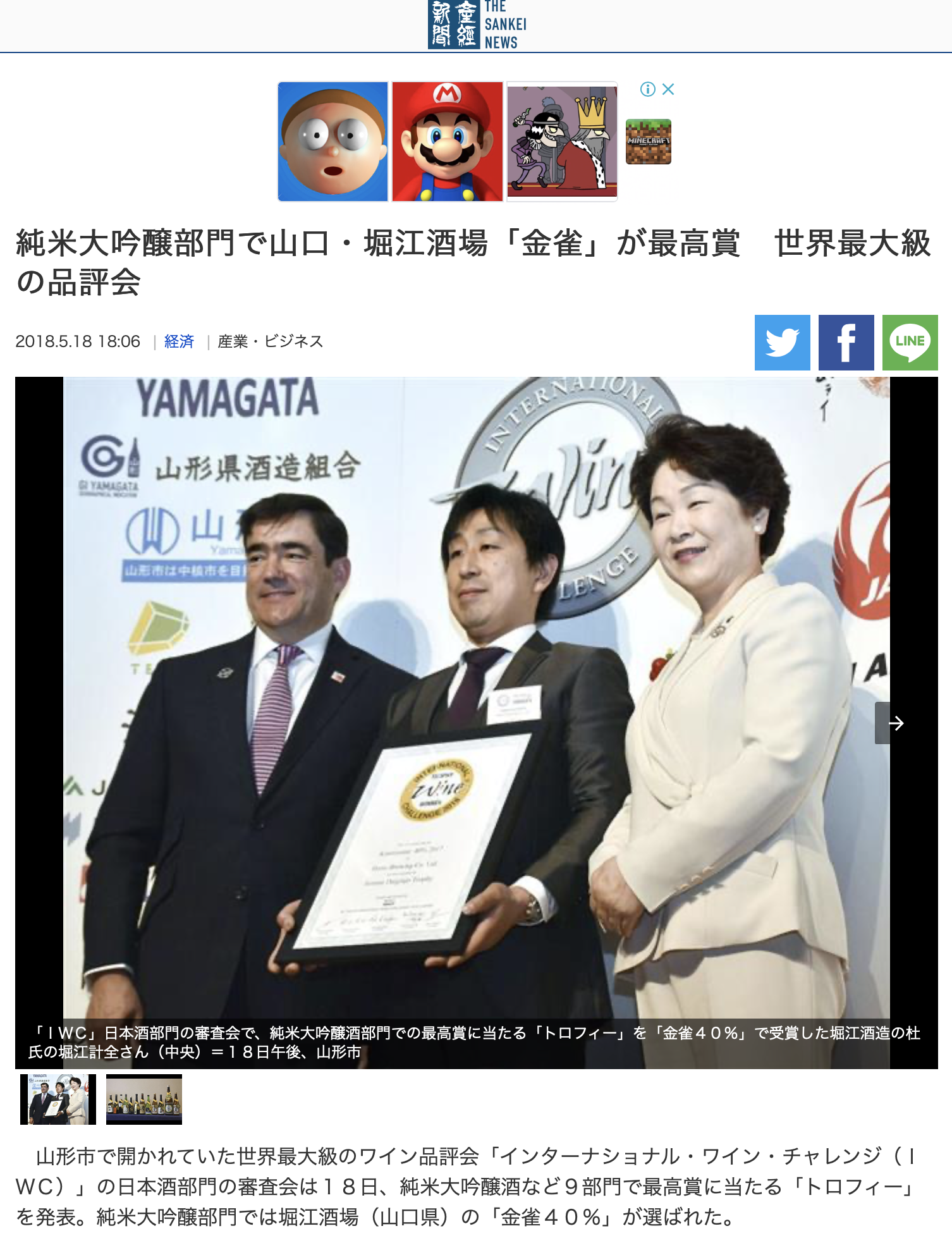 夢雀を生み出した山口県岩国市錦町の「堀江酒場」は、世界最大級のワイン品評会「インターナショナル・ワイン・チャレンジ(IWC)」の純米大吟醸の部で、2016年、2017年、2018年と金賞トロフィーを受賞するなど、技術力の高さを世界に証明しています。
